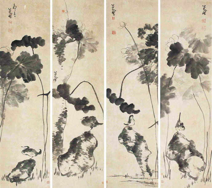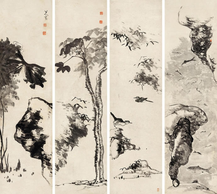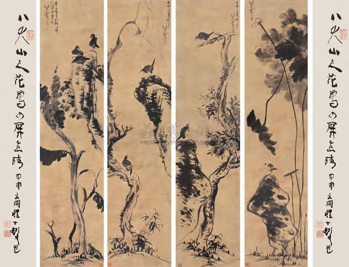 14、八大山人 1692年作 花鸟 四屏 水墨纸本