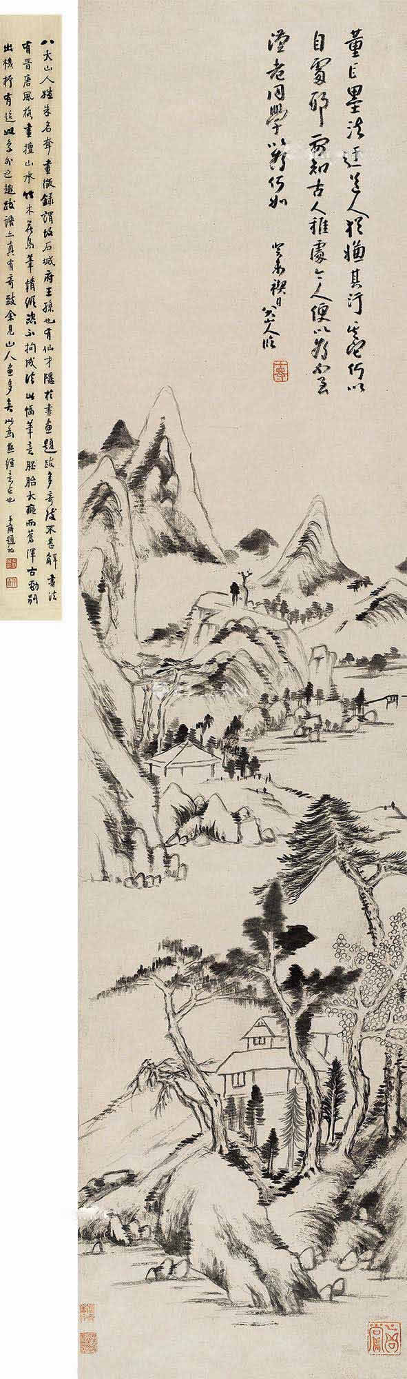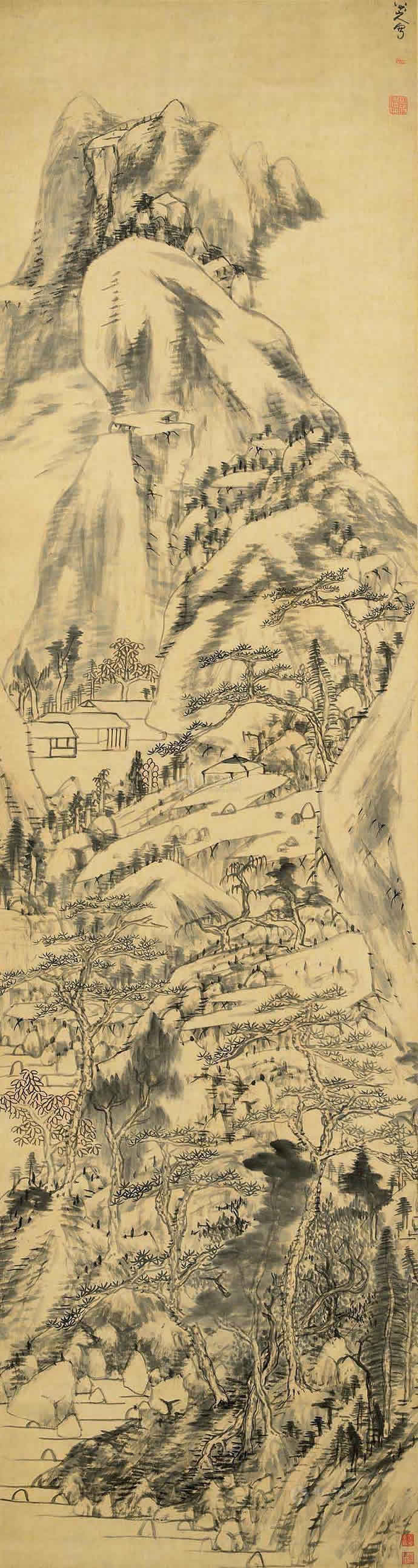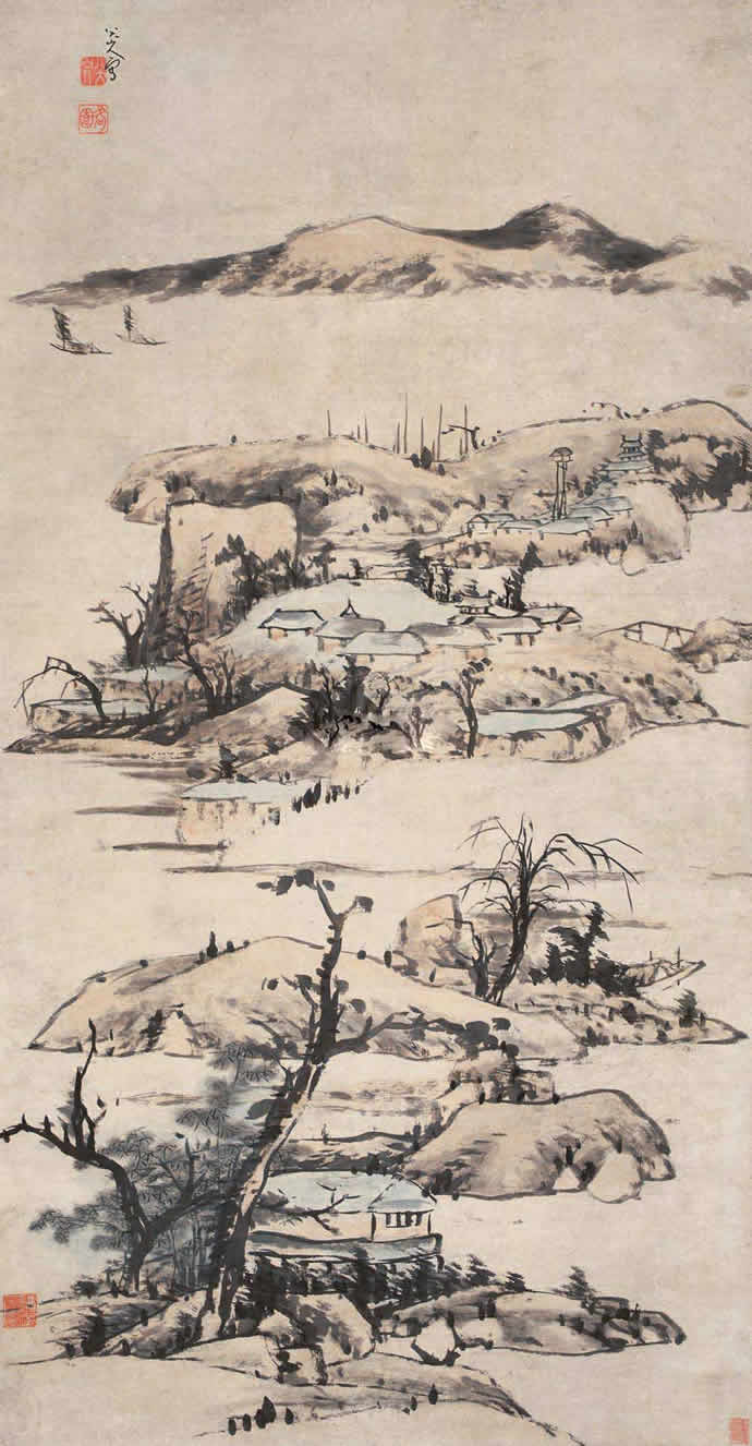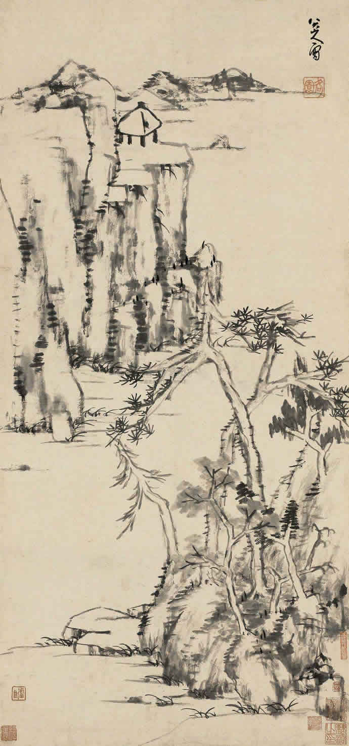 15、八大山人 仿董巨山水 立轴 水墨纸本