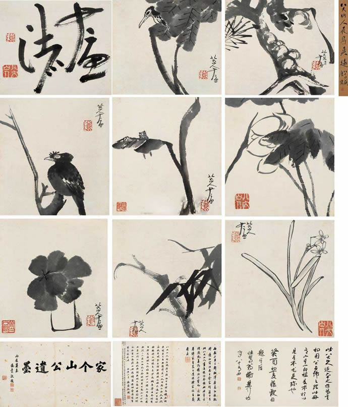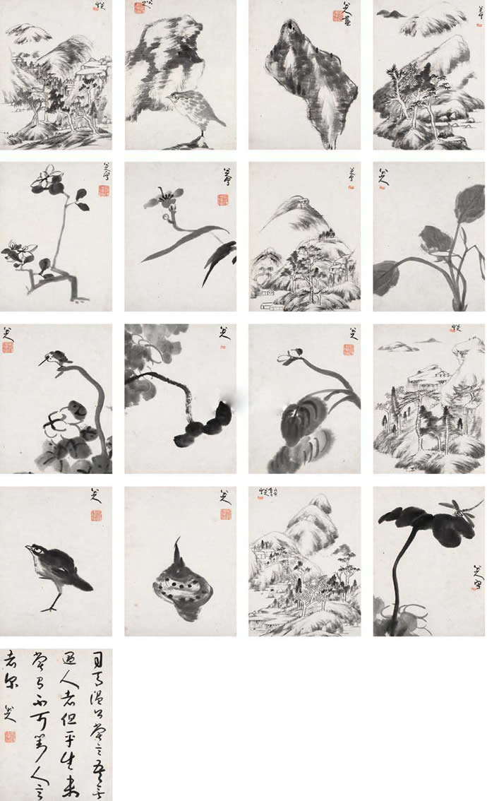 23、八大山人 1698年作 山青水碧鸟语花香 册页 (十七开) 水墨纸本