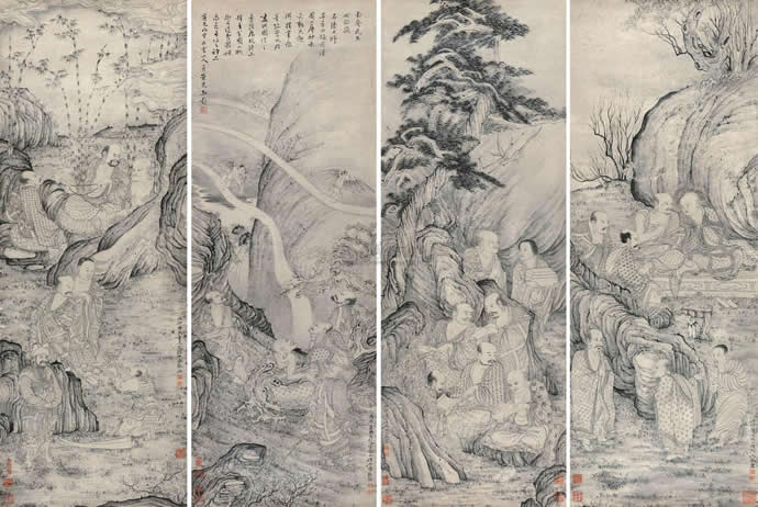 · 石涛 1666年作 五百罗汉图 四屏 水墨纸本