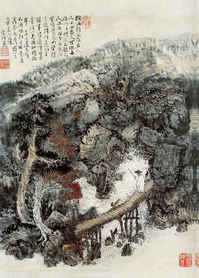 清 髡残 溪桥策杖图轴 苏州博物馆藏