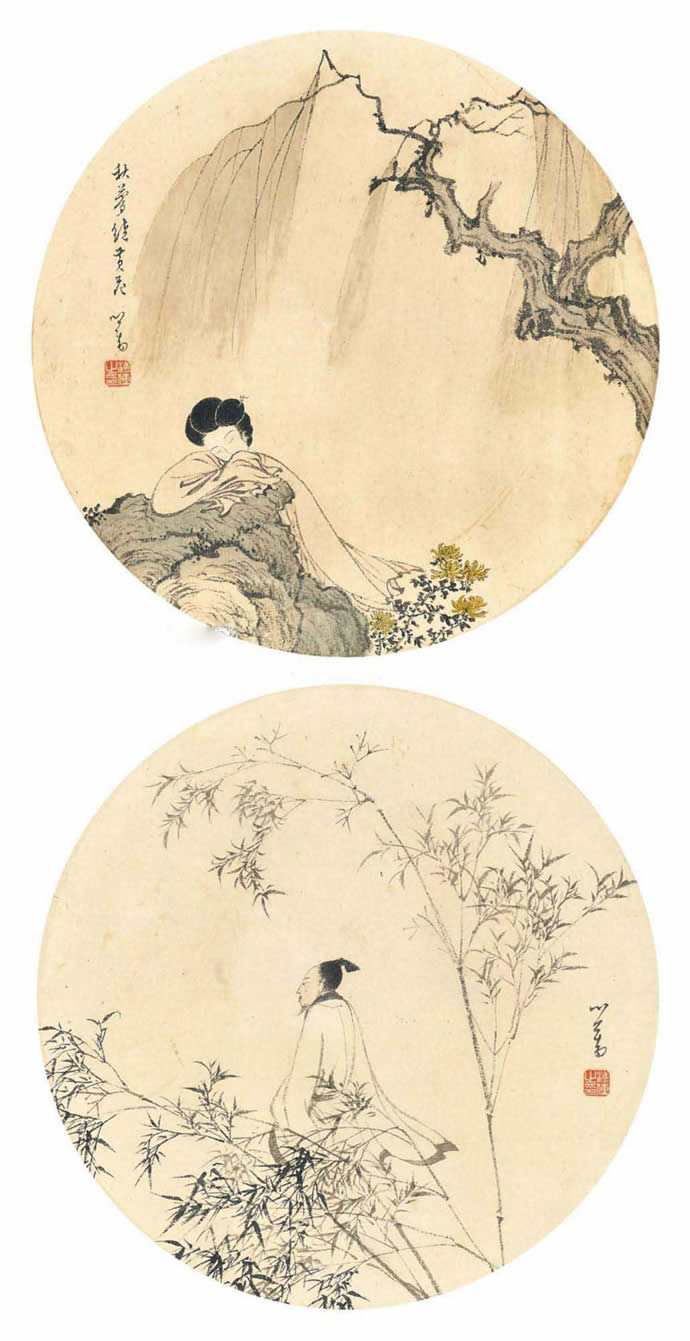 △溥儒 人物画 直径26cm×2