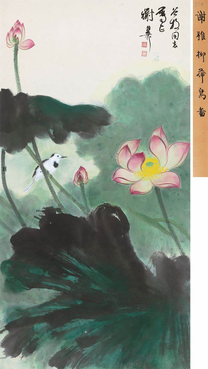 · 谢稚柳 1973年作 翠荷小鸟图 镜片 设色纸本
