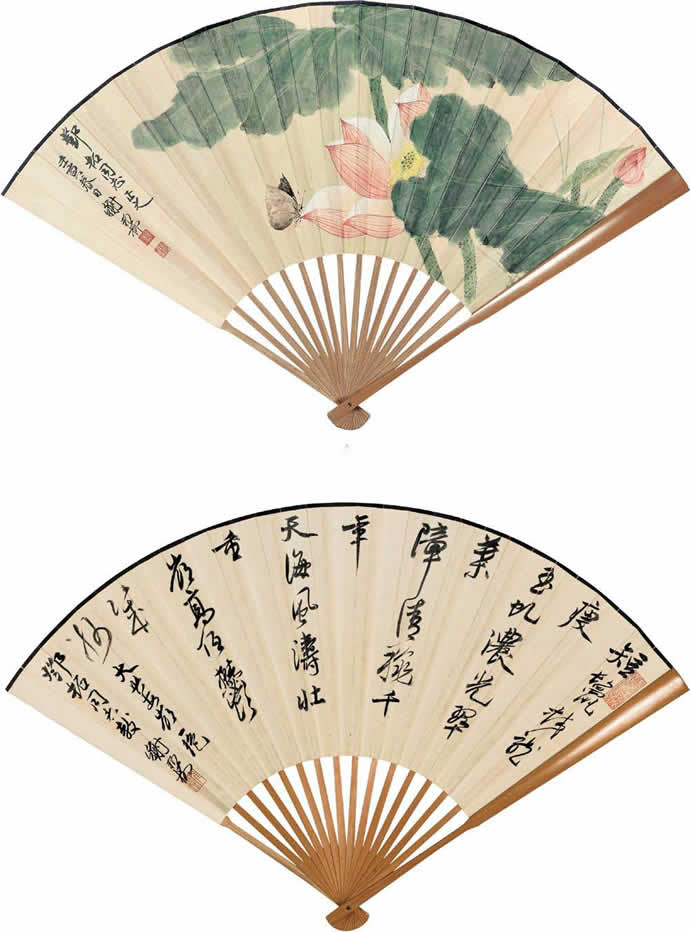 · 谢稚柳 1962年作 红荷粉蝶· 行书七言诗 成扇 设色、水墨纸本