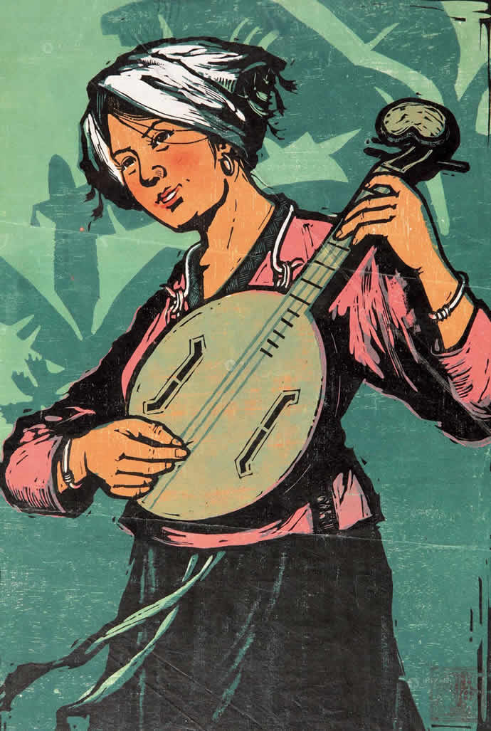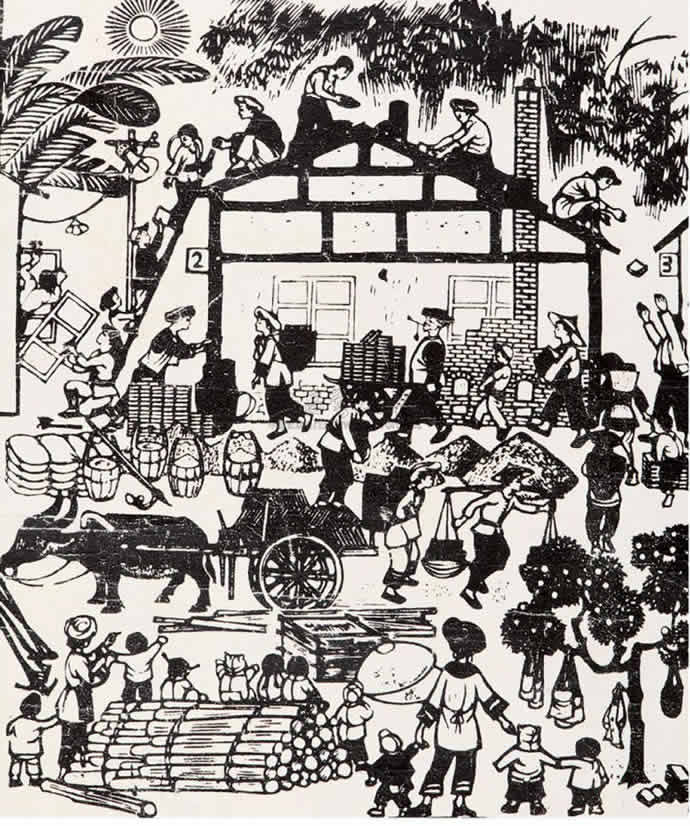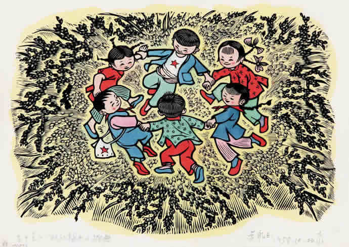 1958年作 在十万斤一亩的稻田上跳舞 木版套色 30×42cm