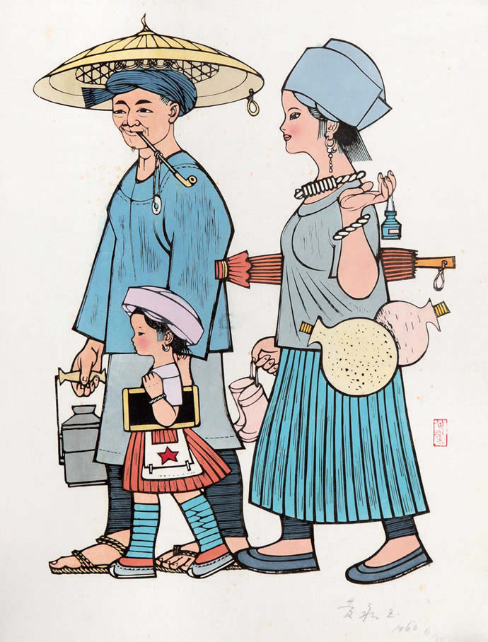 1960年作 全家送我去学堂 木版套色 45×33cm