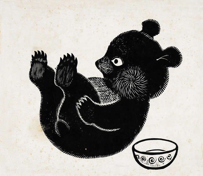 1955年作 淘气的小熊(张梅溪《在森林中》插图) 木刻纸本 16×18cm