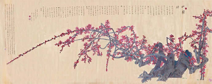 这幅《田家梅》即是他的代表作。金碧辉煌的画面,色彩争奇斗艳,梅花的倔强曲折透出人生的蹉跎,经历近一个世纪的风霜而有铮铮傲骨,绽放出惊世骇俗的灿烂。他以饱满热烈的诗人情怀拥抱当代世界,进入现代人的生命情感,展示出与传统、与古人完全不同的新世界,这是中国当代美术的最高学术成就,为当代美术史写下了弥足珍贵的新篇章。太平盛世,逢时之作。《田家梅》喻意了今日中国文化的辉煌,也是九旬老人对这个时代的祈愿。