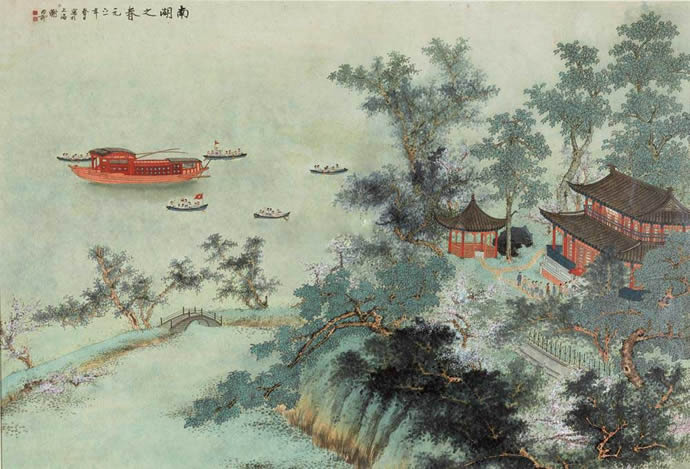 《南湖之春》作于1961年,是在此特殊文艺环境下的“献礼”作品,它的创作距***成立正好四十周年。这幅精工典雅的青绿山水画,极尽勾皴点染之能事,色彩雅致丰腴,与***的“红色”—南湖船和烟雨楼相互辉映;而对游船上孩子们的刻画,当亦有所寓意。《南湖之春》所运用的技法是传统的经典,题材是***的圣地,完美地实现了传统高华和***浪漫的结合。或许由于特殊题材的原因,我们通过这幅作品也可遥想谢稚柳先生当年临笺执毫时毕恭毕敬的严谨的创作态度。
