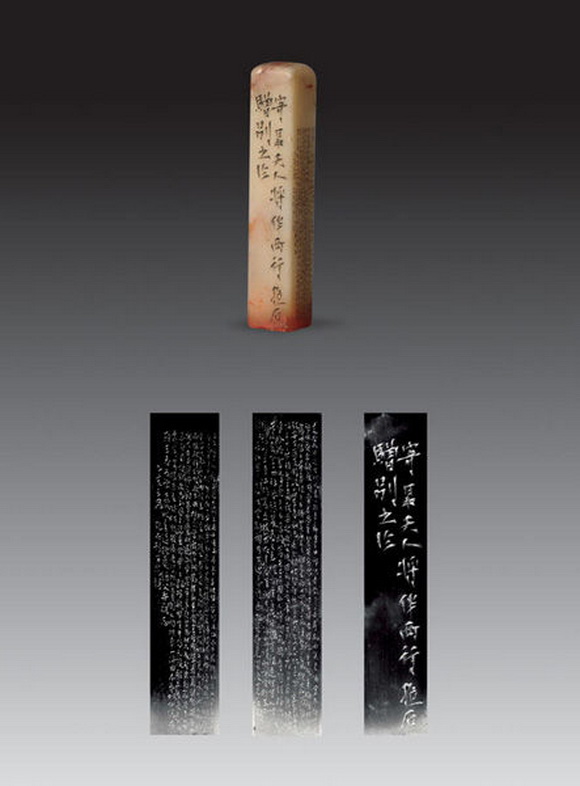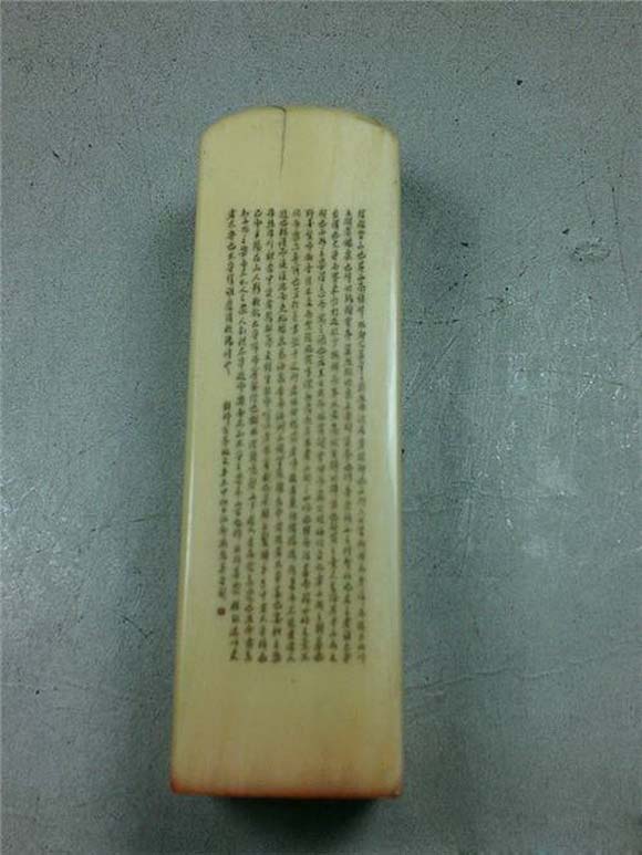 七、印面刻有“造化小儿多事”,边款单面微雕曹子建《洛神赋》并《序》共883字。材质寿山冻石,尺寸2.5×5.0厘米。曾在日本展出,现已失去下落。