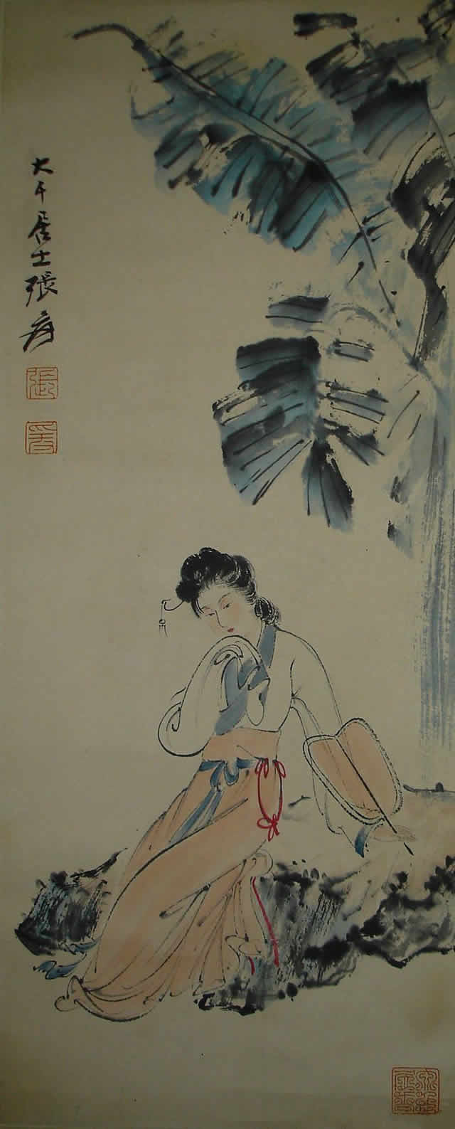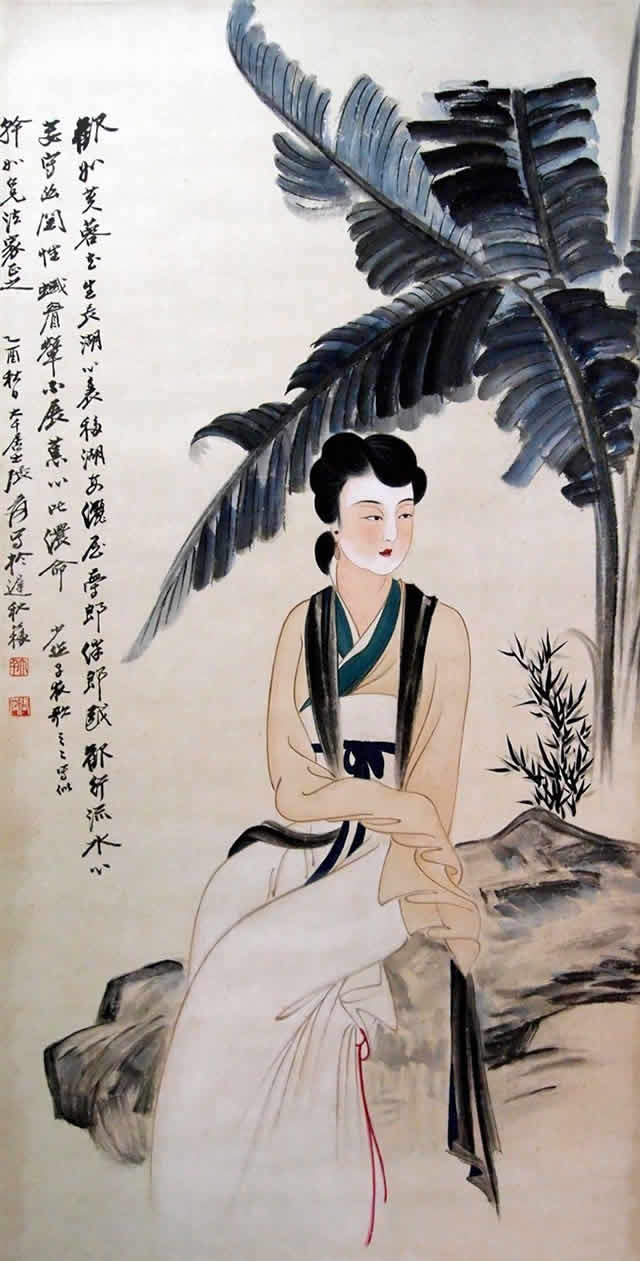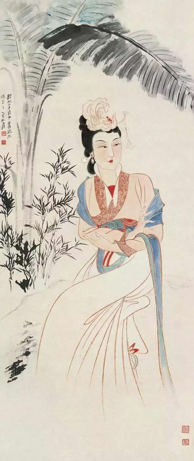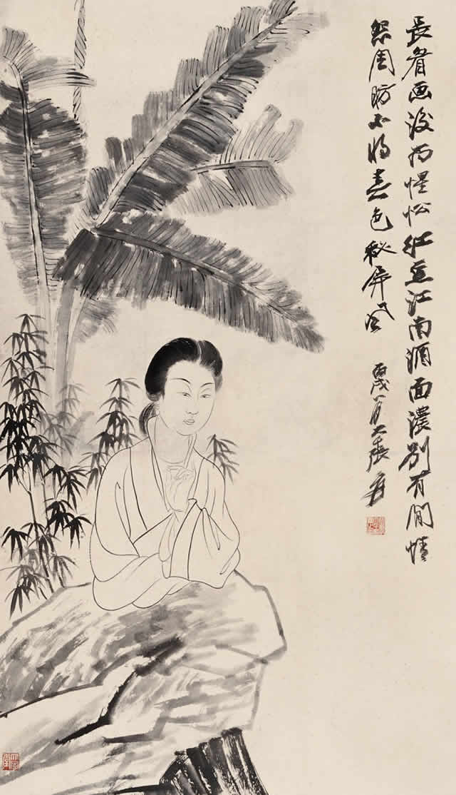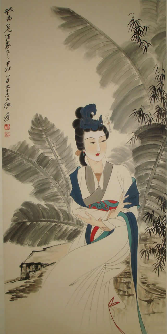 芭蕉仕女图与纨扇仕女图一样,图中的美女依稀可以看到张大千夫人的身影,可见张大千在绘画中,大部分以他的未婚妻、夫人或红颜知己为原型进行创作。美女在风吹欲动的芭蕉树下,秀发垂柳,或深情凝望,或仰首望月,或低眉捻花、回眸善睐,让人赏心悦目,心旷神怡。