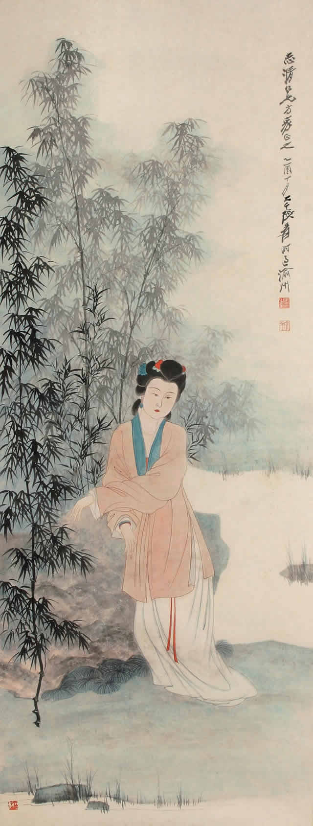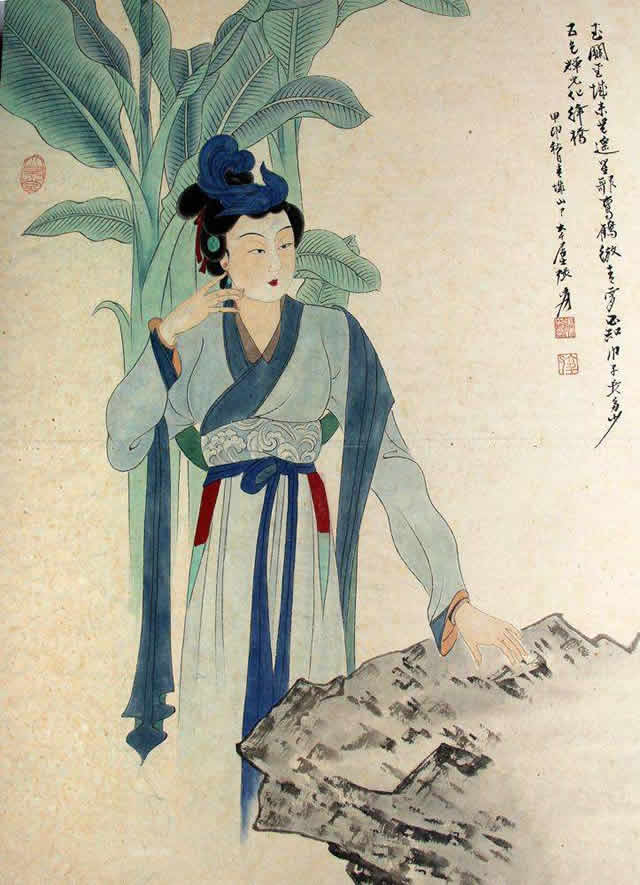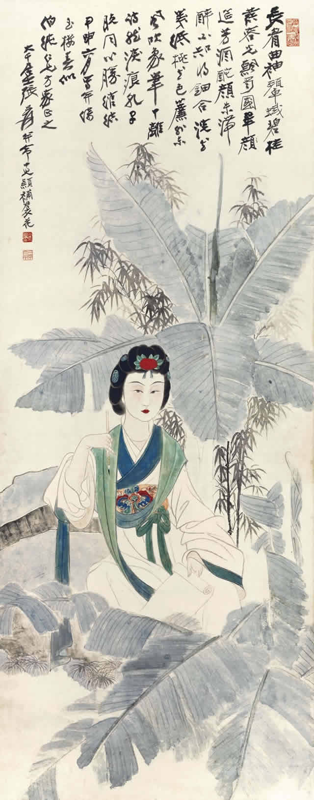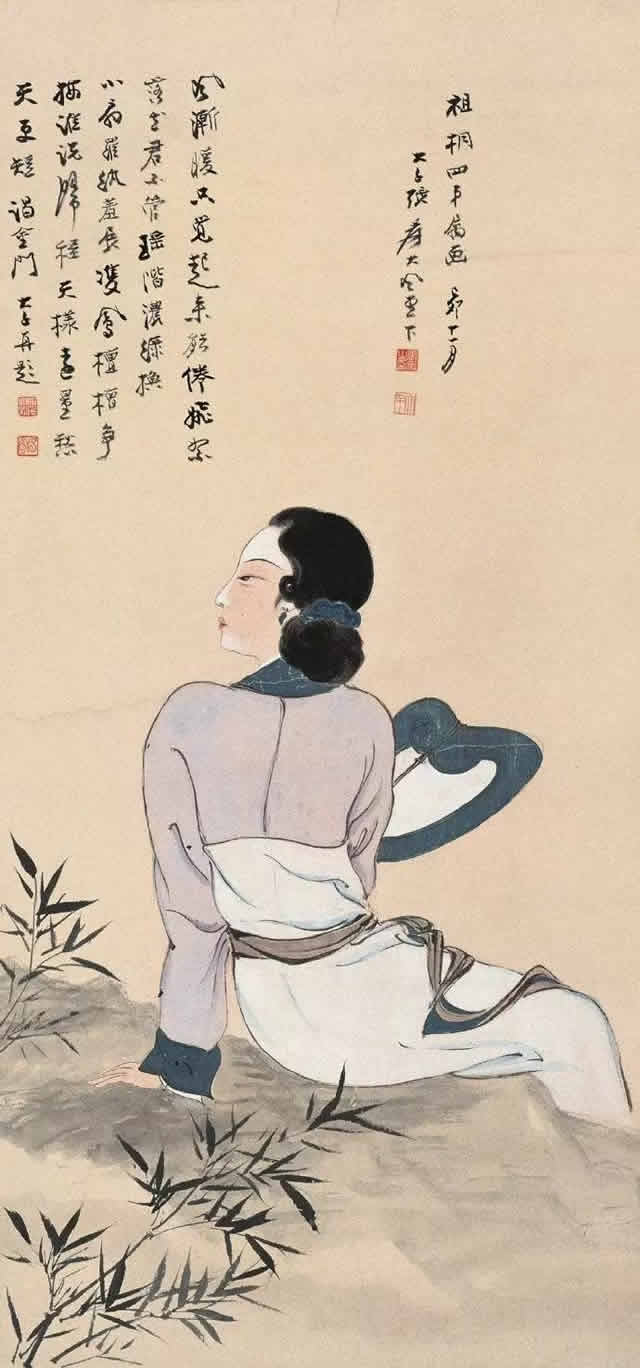 芭蕉仕女图与纨扇仕女图一样,图中的美女依稀可以看到张大千夫人的身影,可见张大千在绘画中,大部分以他的未婚妻、夫人或红颜知己为原型进行创作。美女在风吹欲动的芭蕉树下,秀发垂柳,或深情凝望,或仰首望月,或低眉捻花、回眸善睐,让人赏心悦目,心旷神怡。