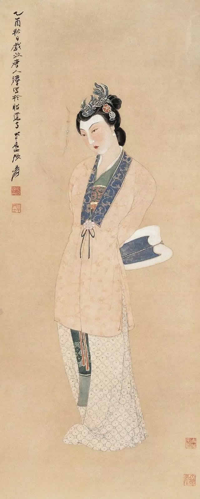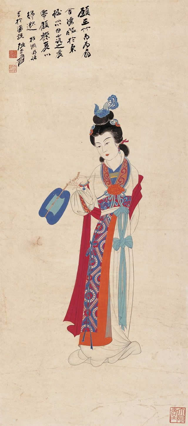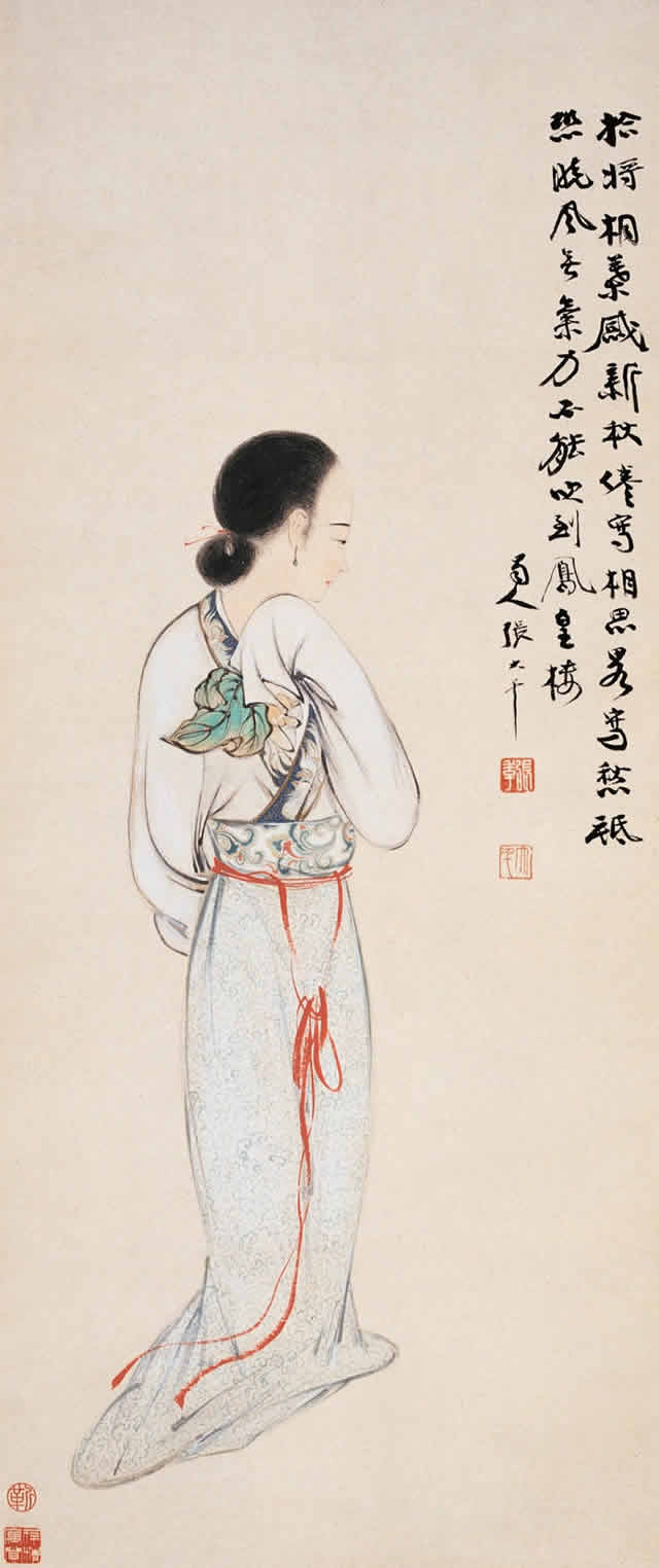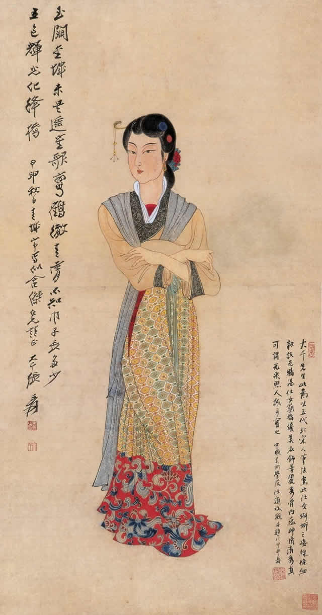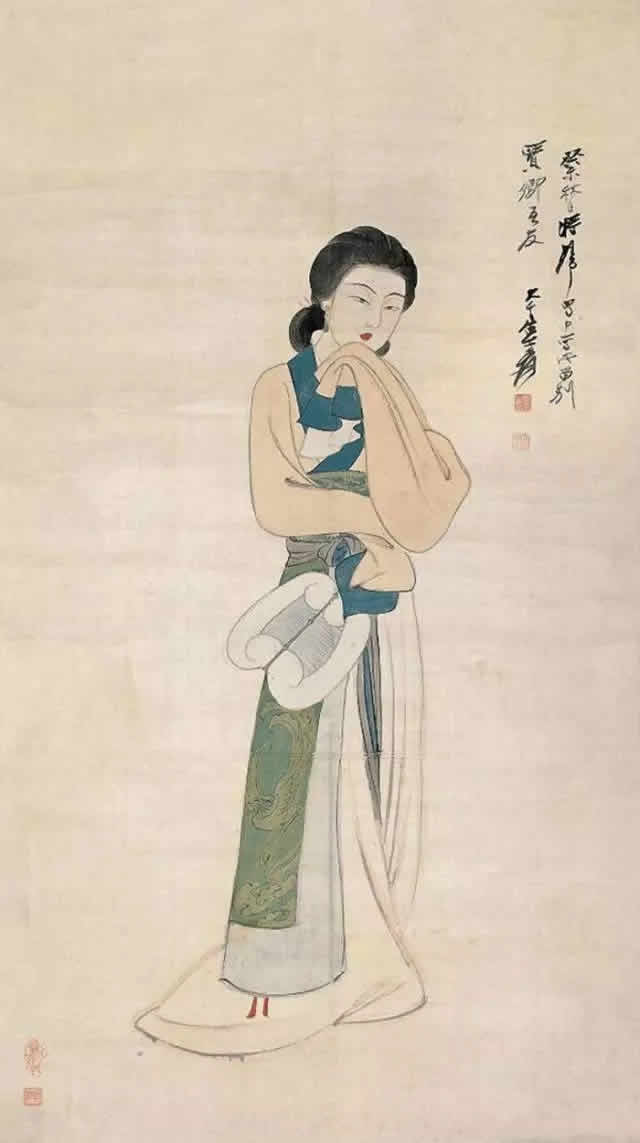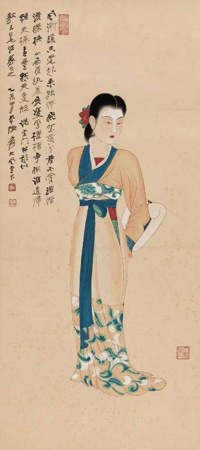 张大千先生唐宋侍女图中的美女脸型圆润饱满,身材丰满性感、姿态娇媚高贵,气质雍容华丽,生动地展示出唐宋两代美女的高贵之美、丰满性感之美、娇媚大气之美等特点。