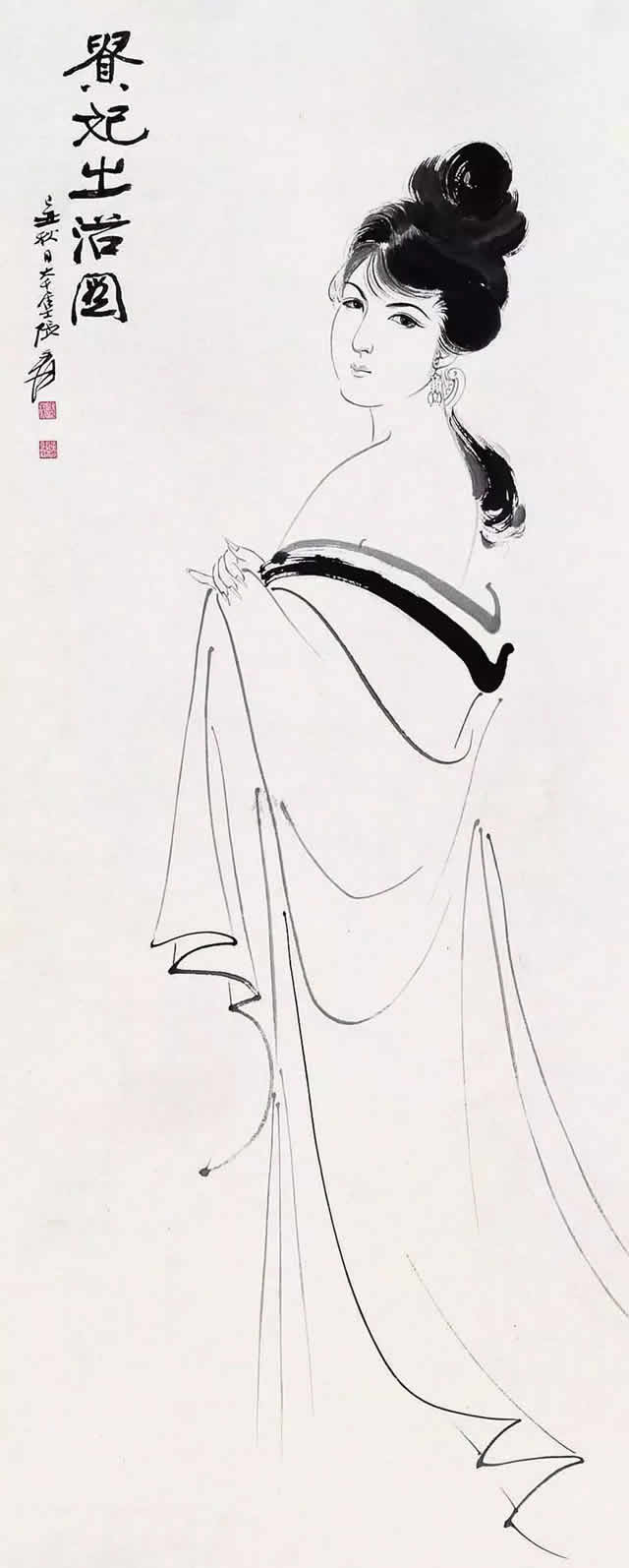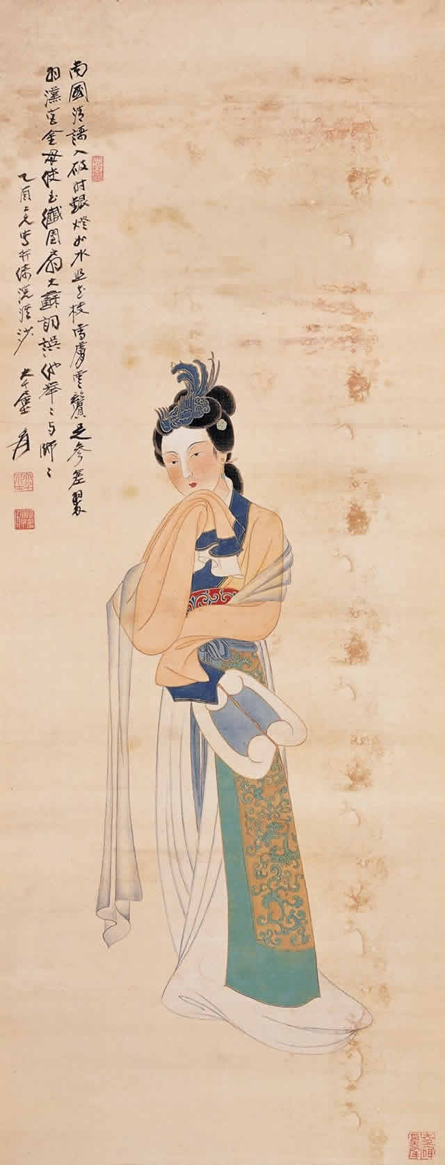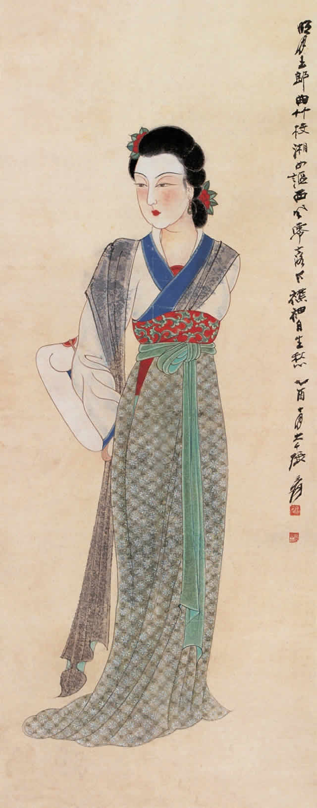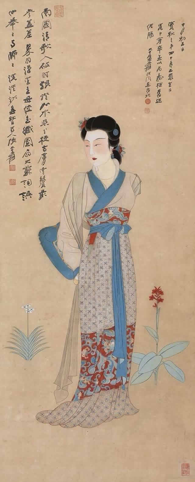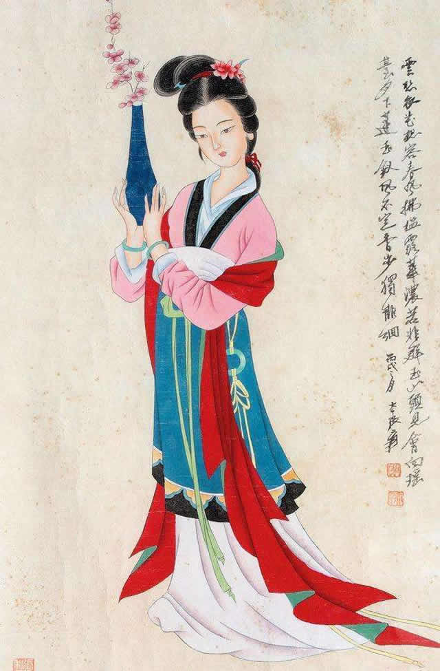 张大千先生唐宋侍女图中的美女脸型圆润饱满,身材丰满性感、姿态娇媚高贵,气质雍容华丽,生动地展示出唐宋两代美女的高贵之美、丰满性感之美、娇媚大气之美等特点。