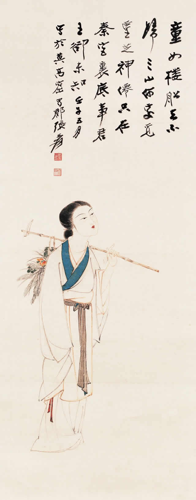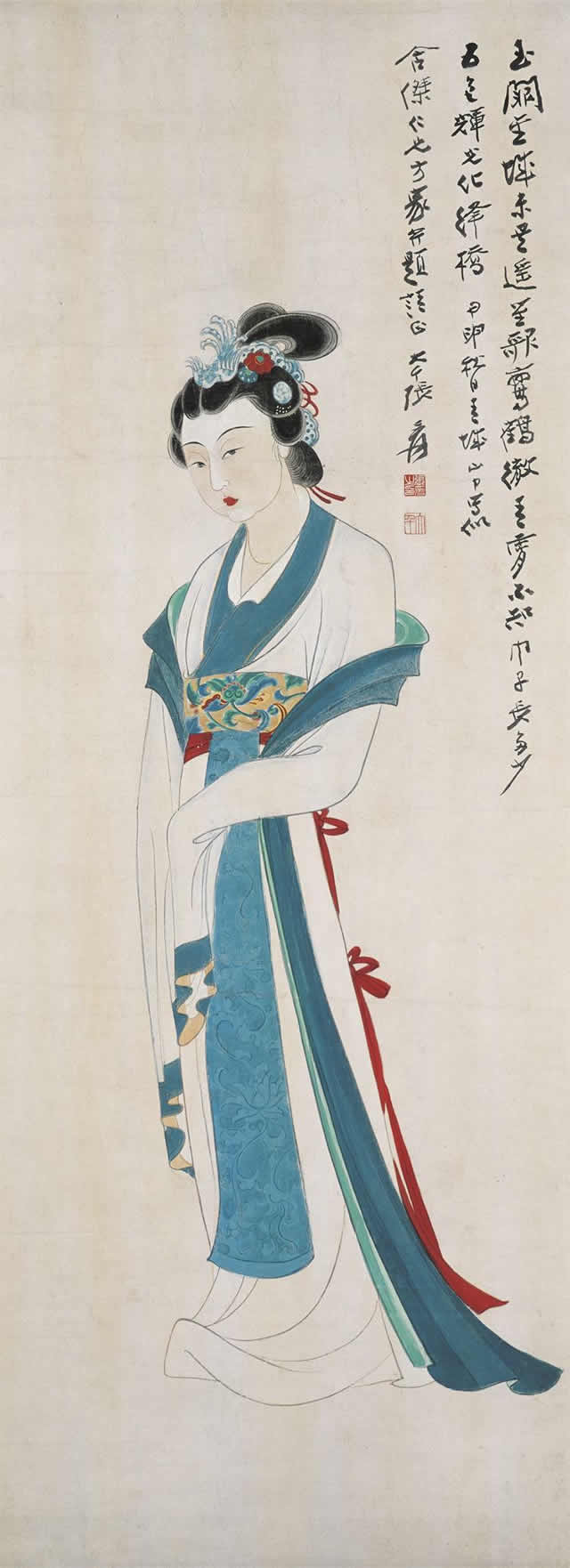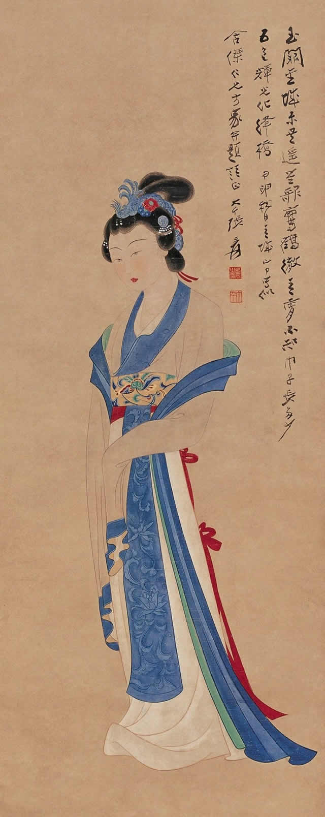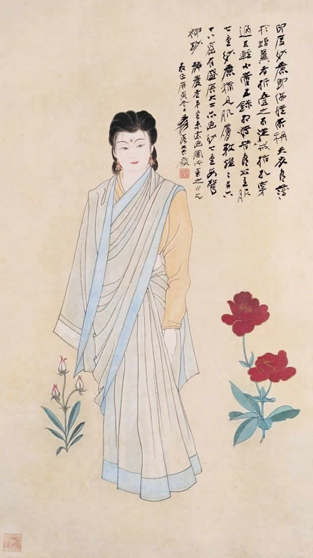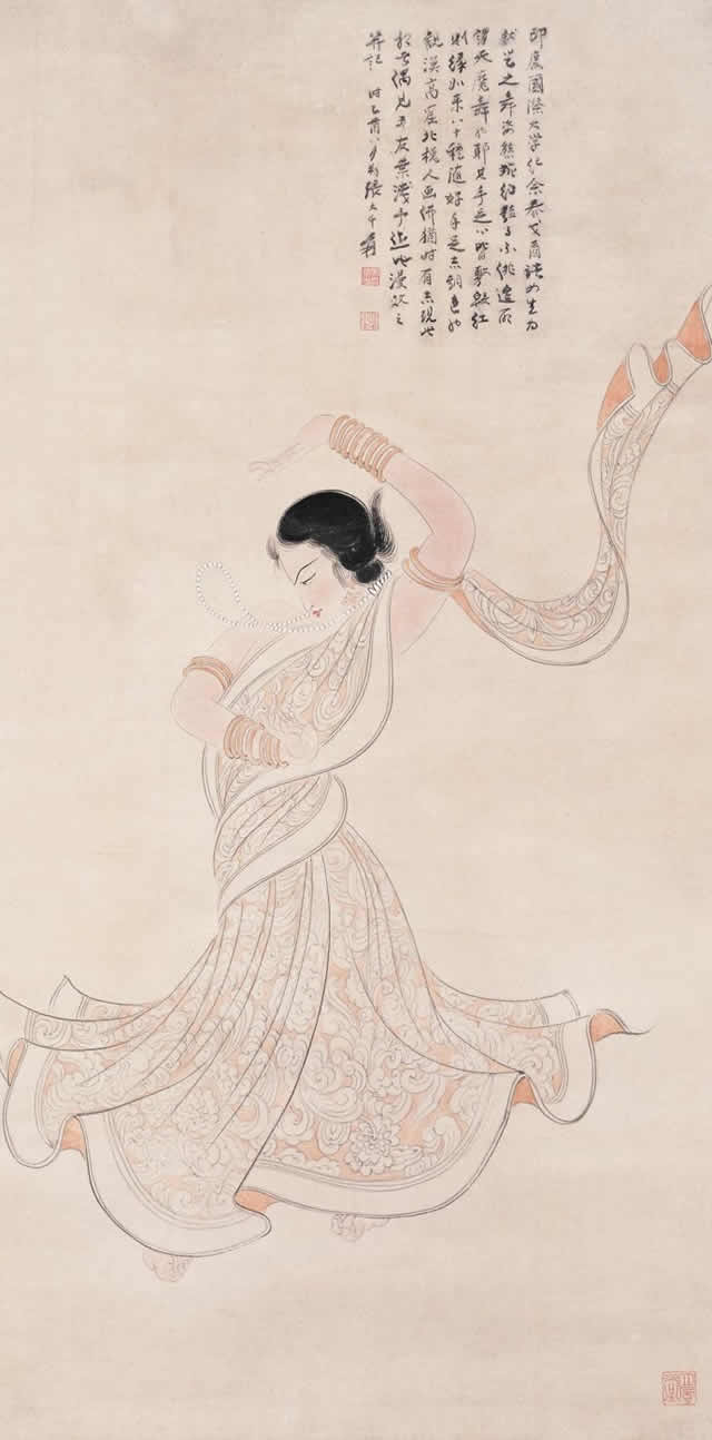 1949年底张大千先生远赴印度,在印度生活11个月。期间在新德里举办一个月的画展,后又到著名佛教胜地阿旃陀石窟研究临摹壁画,历时3个多月。在印度的11个月里,他为印度古代文明艺术所震撼,专心研习吸取印度绘画艺术精华,同时,他也为印度女性独特之美所吸引,创作出多幅印度仕女画。其绘画的印度美女面容端庄圆润,五官标致大气,神态丰满性感,令观者感受到异域女性独特之魅力。