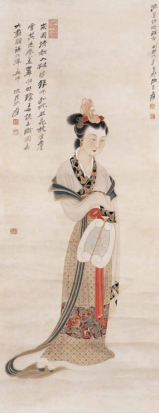 纨扇仕女图为张大千仕女绘画的经典。画中的美人或持扇凝望,或摇扇纳凉,或挥扇戏蝶,仪态万千,加上花竹鸟虫、假山盆景、亭台楼阁等巧妙点缀映衬,相得益彰,美不胜收。