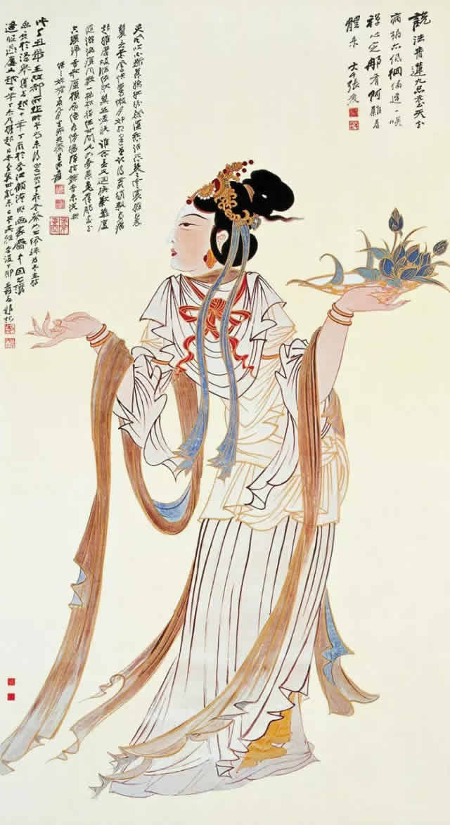 1940年~1943年,张大千先生先后两次赴敦煌莫高窟临摹壁画,其中第二次历时2年7个月,张大千先生废寝忘食,辛勤劳作,一共临摹了270多幅壁画。敦煌壁画这一中华古代艺术瑰宝,对其仕女绘画创造产生重大的影响,张大千巧妙借鉴敦煌壁画的画风画技,不断吸取其中的元素和精髓为己所用,创作了大批的敦煌仕女图。