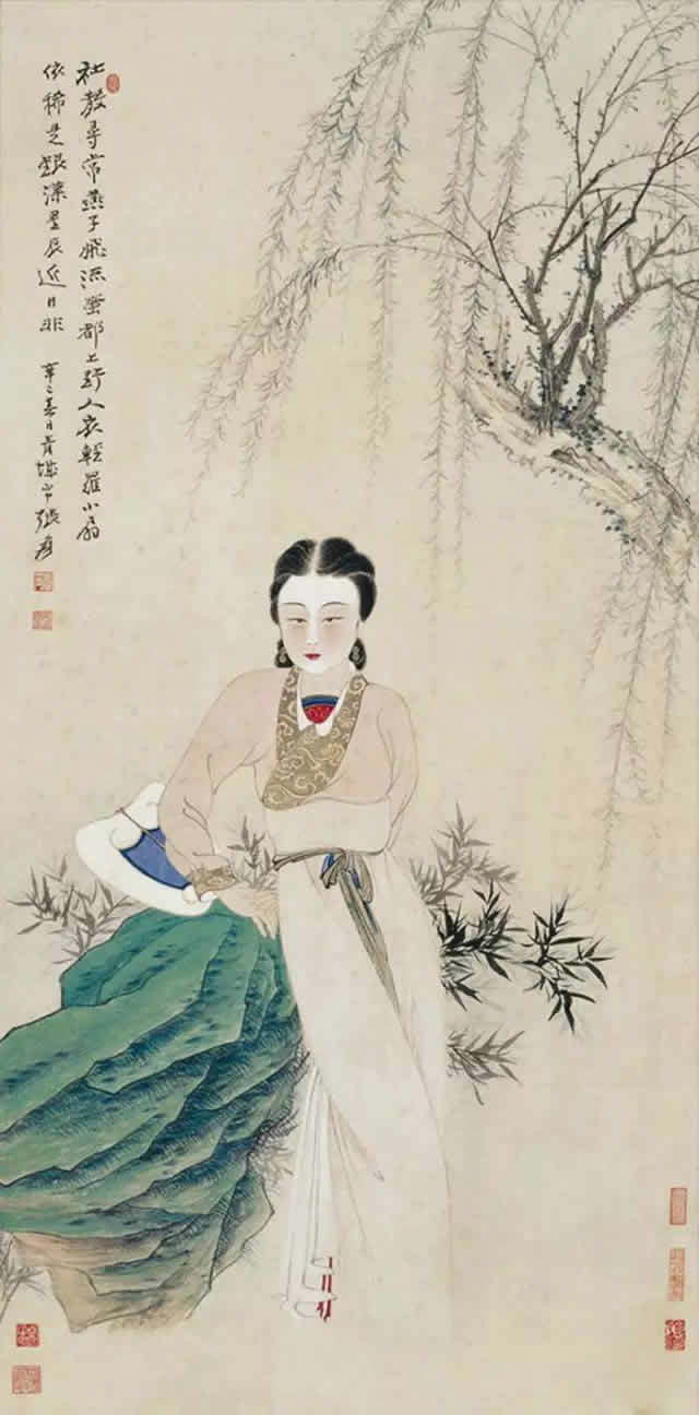 明清仕女图绘画精妙细腻,画中的仕女容貌端庄清丽,身段婀娜多姿,仪态典雅娴静,令人赏心悦目、心旷神怡。特别是清代美女长颈削肩,纤手柳腰,秀脸细目,樱唇小嘴,为典型的小家碧玉形象,风露清愁、黯然神伤、娇嫩无力、弱不禁风的神态楚楚动人,令人不禁产生怜爱之心。