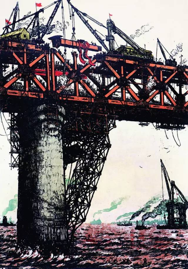 △武石 最后一根钢梁 木版套色 湖北美术馆藏