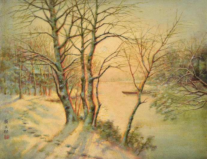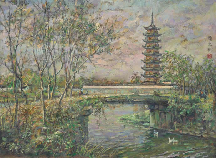 颜文梁(1893年7月2日-1988年5月1日),生于江苏苏州,中国著名画家,美术教育家。在中国近现代美术教育史上,颜文梁是与徐悲鸿、刘海粟、林风眠齐名的四大美术教育家之一。颜文樑的创作多以风景绘画为主,画风写实,成功地结合了欧洲印象派丰富的色彩光影变化与中国传统绘画的优美意境,利用色阶层次细致入微地表现大自然的微妙变化,展现清新质朴、细腻淳厚的颜氏绘画风格。充分体现“颜老夫子”小笔触层层铺扫,以柔带写,色层坚实的绘画特质。