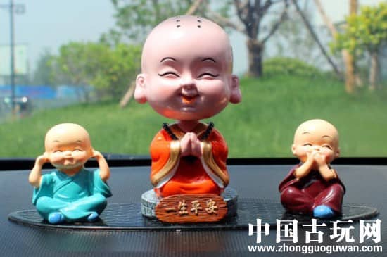 将摇头小和尚车饰摆放在车窗前,寓意着出入平安,人们在开车的时候,能够借此祈求佛祖保佑,平安归来。