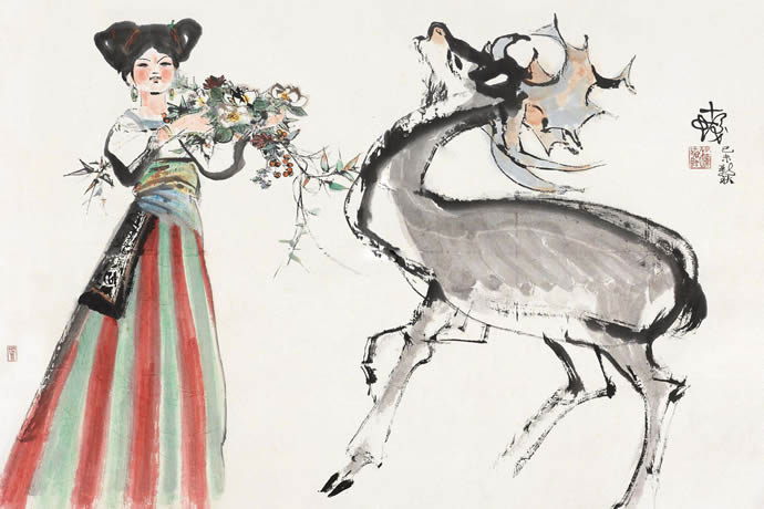 除了花鸟画外,程十发对于人物画也十分精通。尤其是少女,成为程十发绘画题材中的“常客”。通常此类作品中身着民族服装的少女,笑容满面,画面充溢着云南少数民族普通生活的趣味。如程十发1979年作《荷塘少女》在2010年西泠拍卖中,以30.24万元成交。2015年12月《少女与鹿》在上海荣宝斋以230万元拍出。