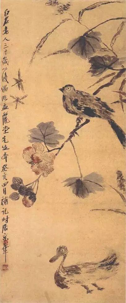 三十岁以后画作《芙蓉鸭子图》,创作于1892年后,画中鸭游于水,芙蓉低垂,枝上立鸟,生动有趣,现藏于北京画院。