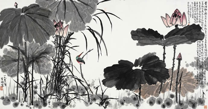 △李苦禅1972年作《荷花翠鸟》96×180.5cm