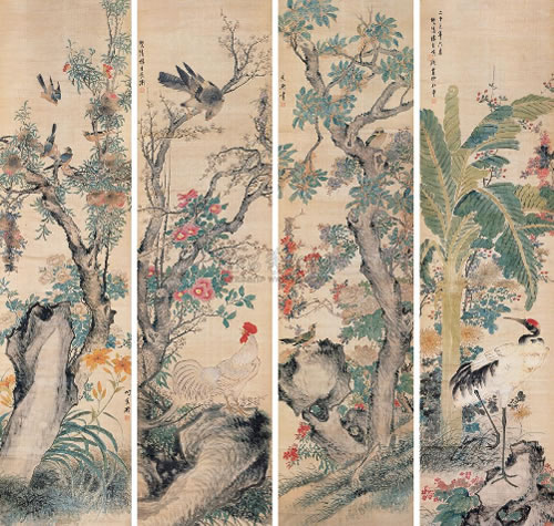 · 1934年作 花鸟 四屏 设色绢本