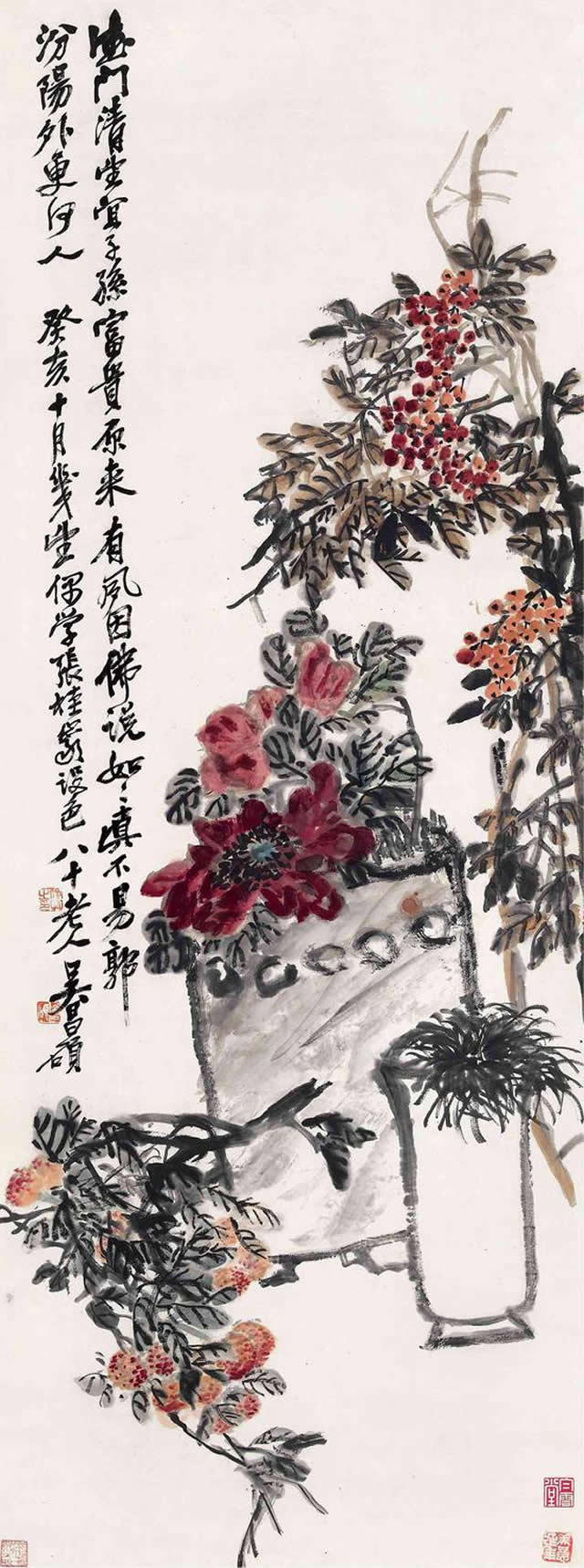 《富贵寿考》作于1923年,时年八十岁的画家,愈至晚年,书画愈具气势,笔墨放纵,烂漫天成,深得大写意花卉画的精髓。吴昌硕曾言“奔放处要不离法度,精微处要照顾到气魄”,此作布局章法考究,画面中心硕大花盆中两朵牡丹盛放,右下置一盆蒲草,荔枝与天竹分置上下,与牡丹共同构成斜角取势,左上两行一气贯通的题识,与花果呼应,使画面稳固平衡,神完气足。笔法、墨法无不苦心经营,牡丹娇艳,天竹、荔枝枝叶繁茂,果实累累,花朵、果实以洋红、朱磦画就,与墨绿、赭色染出的枝叶分布讲究,和谐相生,浓淡调和之间呈现鲜活之态。水墨写成的蒲草、一灰一白两只花盆,辅以苍劲拙重的金石线条,将一派绚烂收之于古拙。