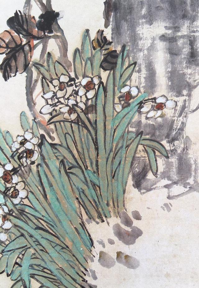 吴昌硕笔墨设色重、拙、大,金石味道十足。用墨浓淡干湿,各得其宜,表现出物象的内在气质和生命力。画中牡丹盛开摇曳,富贵之气溢于纸上水仙碧绿青翠,超凡脱俗。牡丹枝干以篆籀入画,下笔沉稳,徐疾虚实,抑扬顿挫,金石味极浓水仙则用行草笔法,活泼流畅,松动飘逸、牡丹叶以大笔饱墨挥写,依枝干之势,上下错落,浓淡相生,元气淋漓水仙用墨清淡,干湿适度,极富神韵。牡丹用没骨法画成,施以署红,用色沉稳,艳而不俗水仙以汁绿淡染,素雅清高。艳者更艳,雅者更雅,真正做到了雅俗共赏。