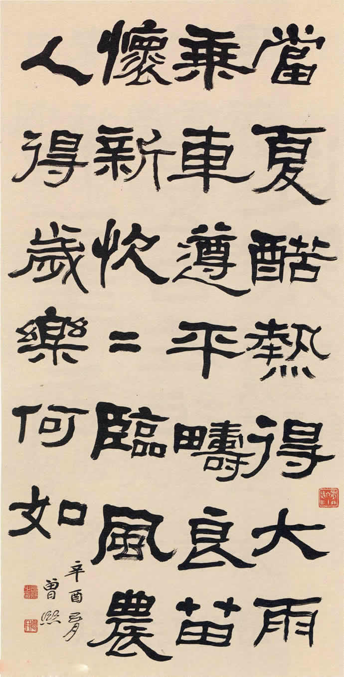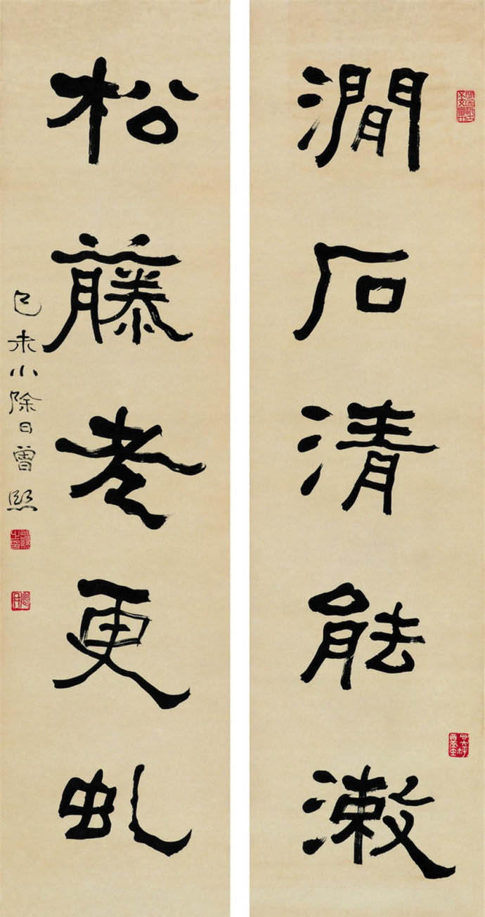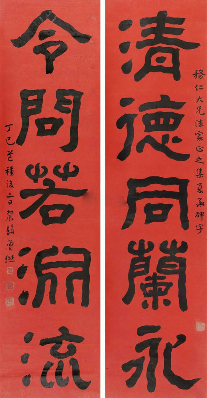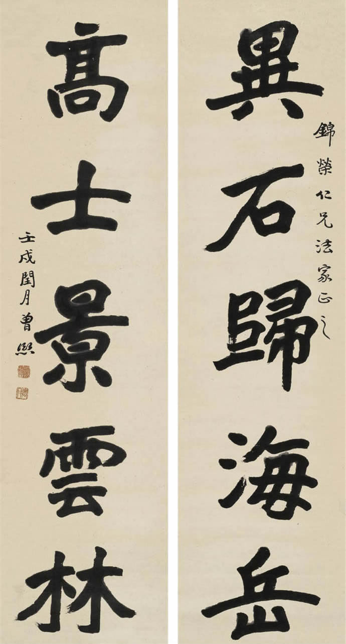 曾熙(1861-1930),湖南衡阳人。工诗文,擅书画。书法自称南宗,与李瑞清的北宗颉颃,世有“北李南曾”之说。1915年始于上海鬻字。其书得力于《夏承碑》、《华山碑》、《张黑女》等,以汉隶圆笔为本,下穷魏晋,沟通南帖北碑,融合方圆,遂成就宽博纵逸的风貌。