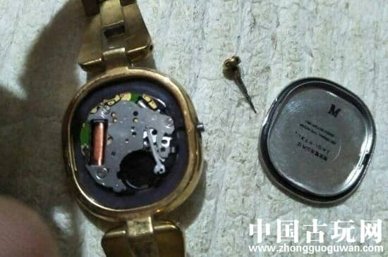 2、表盖打开之后,有的手表可以直接看到里面的电子会用一个金属小棍卡住。这种手表只需要用小刀拨动金属小棍至一侧,再挑出里面的电池,旧电池就可以取出来并放入新的电池。