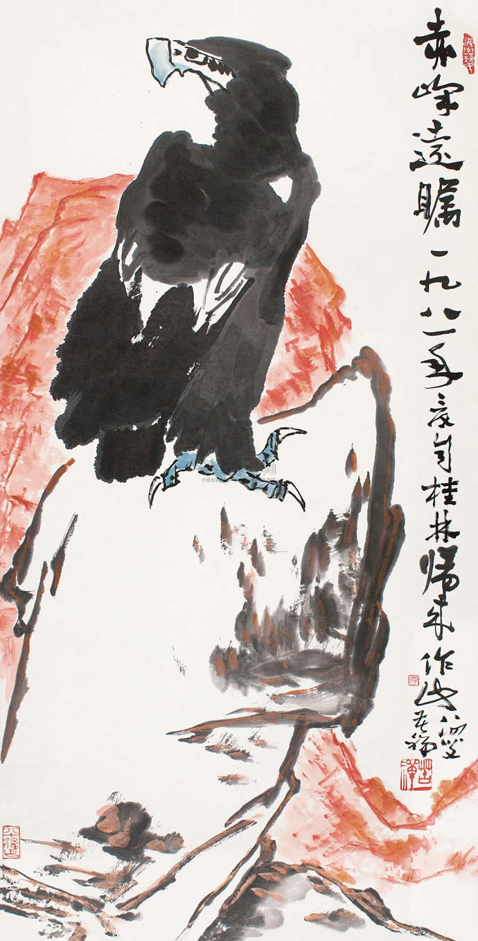 单鹰题材最为李苦禅喜爱,其作品数量也最多。此类画作最具有代表性的作品是作于1981年的《赤峰远瞻》立轴,此画作在2012年、2013年连续两年出现在上海嘉禾与北京保利拍卖会上,每次出现都以逾六百万的高价刷新了个人单只苍鹰画作的价格纪录。此作不足八平尺,均价已达80万元/每平尺。