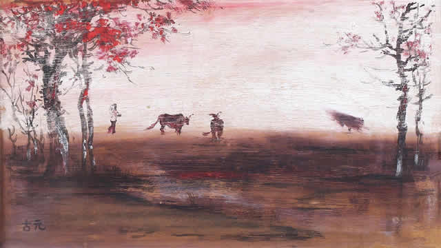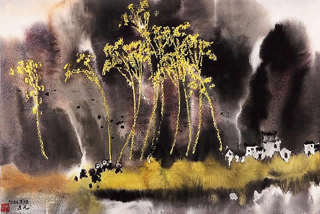 中晚年,古元将对艺术与生活的满腔热情与真诚倾注于水彩画之中,这也是他艺术道路上的另一突出成就。古元的水彩画非常讲究意境,他从不单纯从表面去描绘景色,也不去单纯追求光色的变化,而是对景物进行高度的艺术概括。他的水彩画在技法上没有固定的师承,没有欧洲水彩画强调的那种丰富的色彩及透明的质感,用他自己的话说是“具有乡土味的”,他用最朴实的语言去表现内心情感的东西,只有慢慢地体会,才能感受到古元的动人之处。