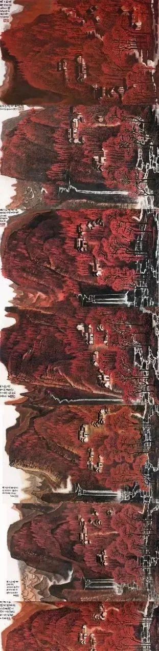 看画之前我们先要“科普”一下所谓的“红色山水”。传统的山水画以水墨为上,即使用色彩也是用淡淡的赭、青、绿进行局部的点然,会意即可。除去宫廷绘画中“青绿山水”的传统,很少有人用浓重的彩色描绘山水。