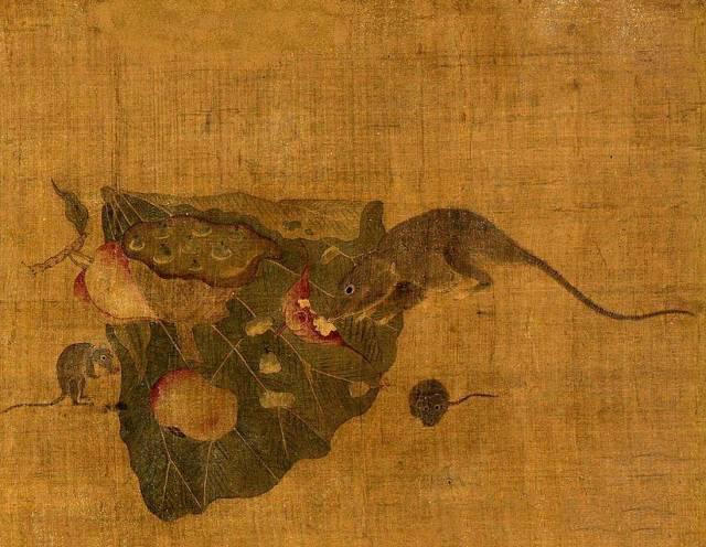 宋末元初的钱选是一位技法全面的画家,他的画大多笔势细腻,却又显得质朴和稚趣。他画的《黠鼠图》是目前我们所能见到的最早的一件画鼠作品。画中的老鼠正在偷食瓜果,每个老鼠的形态不一,笔触细腻,老鼠的狡黠形象跃于纸上。