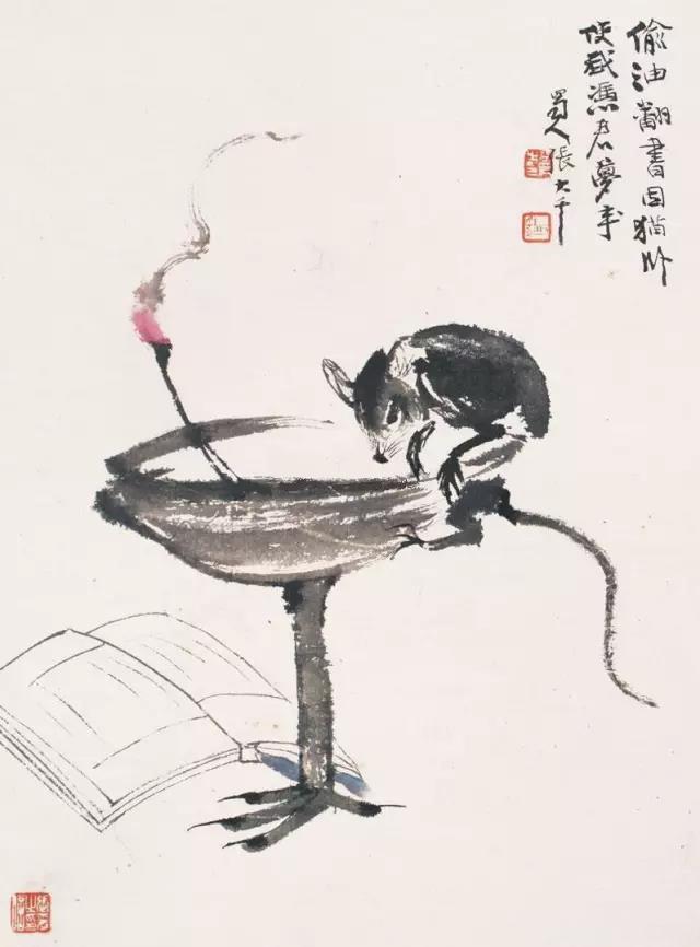 张大千是全能型画家,中国画人物、山水、花鸟、鱼虫、走兽,无所不能,无一不精。《灯鼠图》同样取材于“老鼠偷油”的典故,画家运用娴熟的泼墨技法,笔触浓淡有致,几笔间勾勒出灯台与老鼠,极为生动,情趣盎然。
