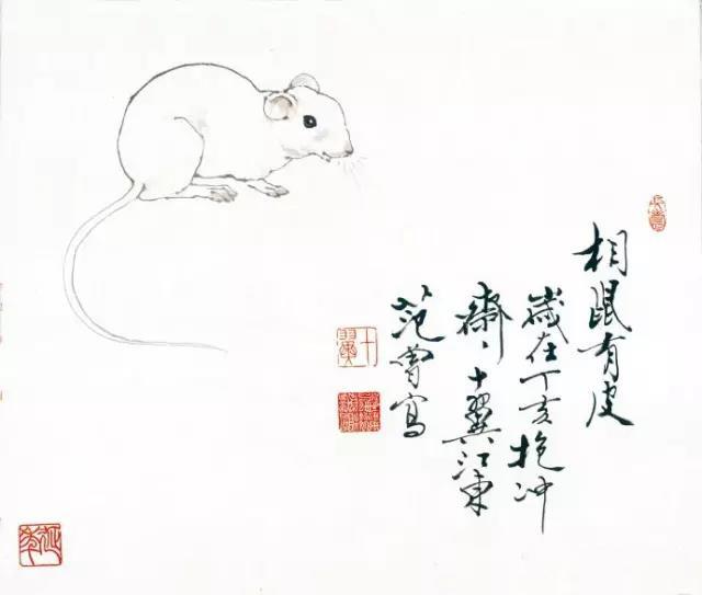 范曾作画主张用石涛“一画论”之精义,力追天籁之境,精于白描。他的鼠图采用简洁的手笔:清新典雅,潇洒飘逸,诩诩如生, 呼之欲出,风骨独具。