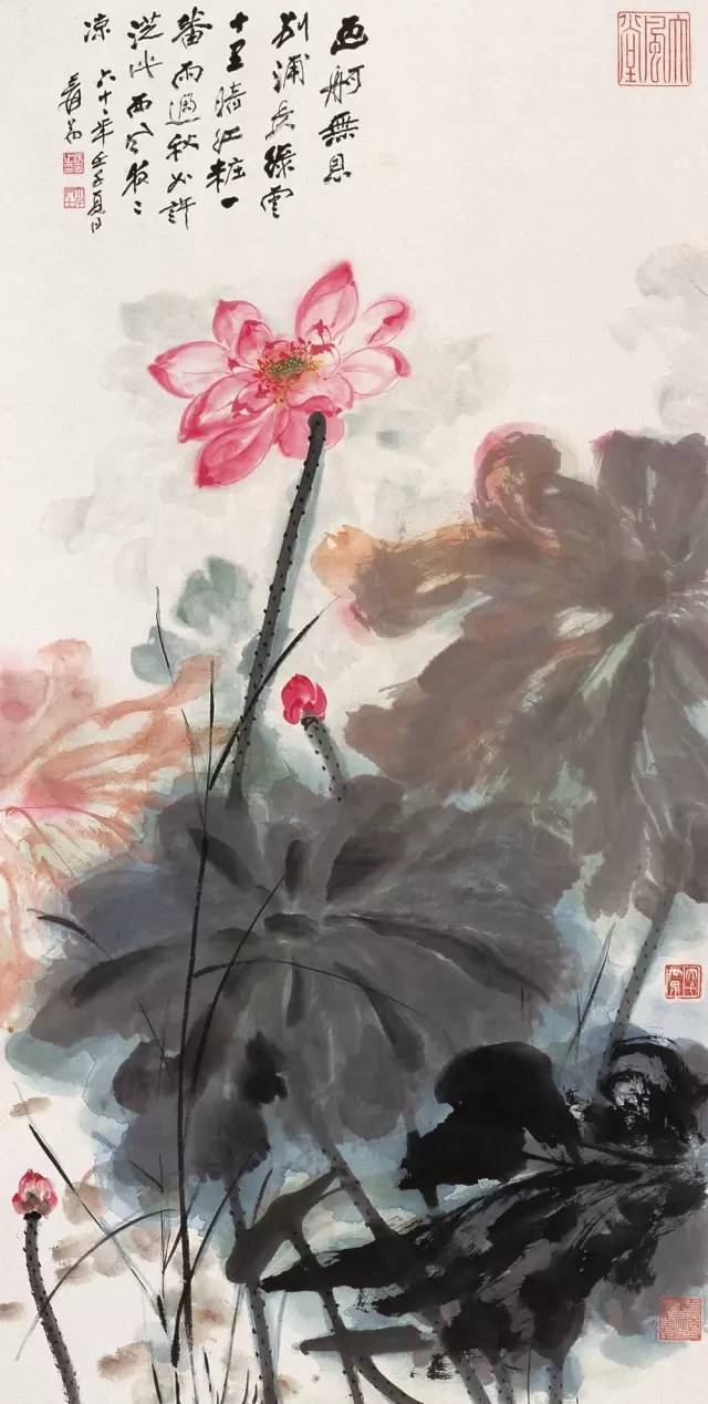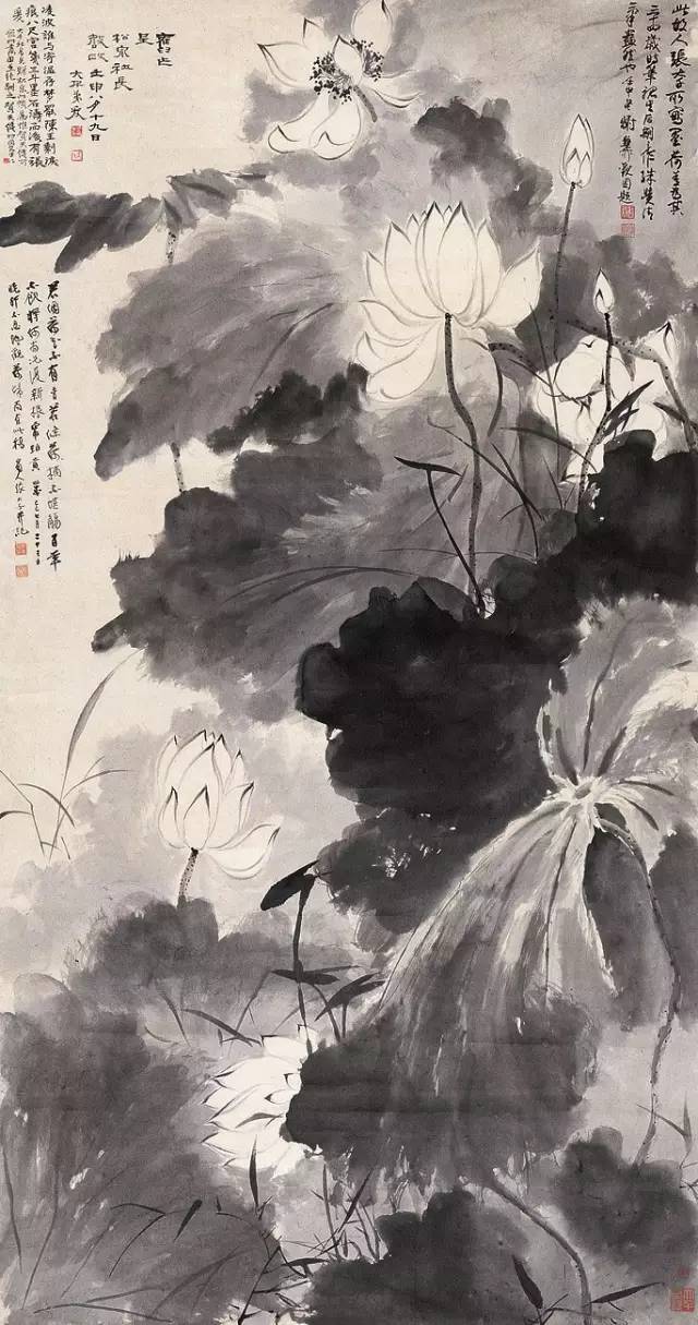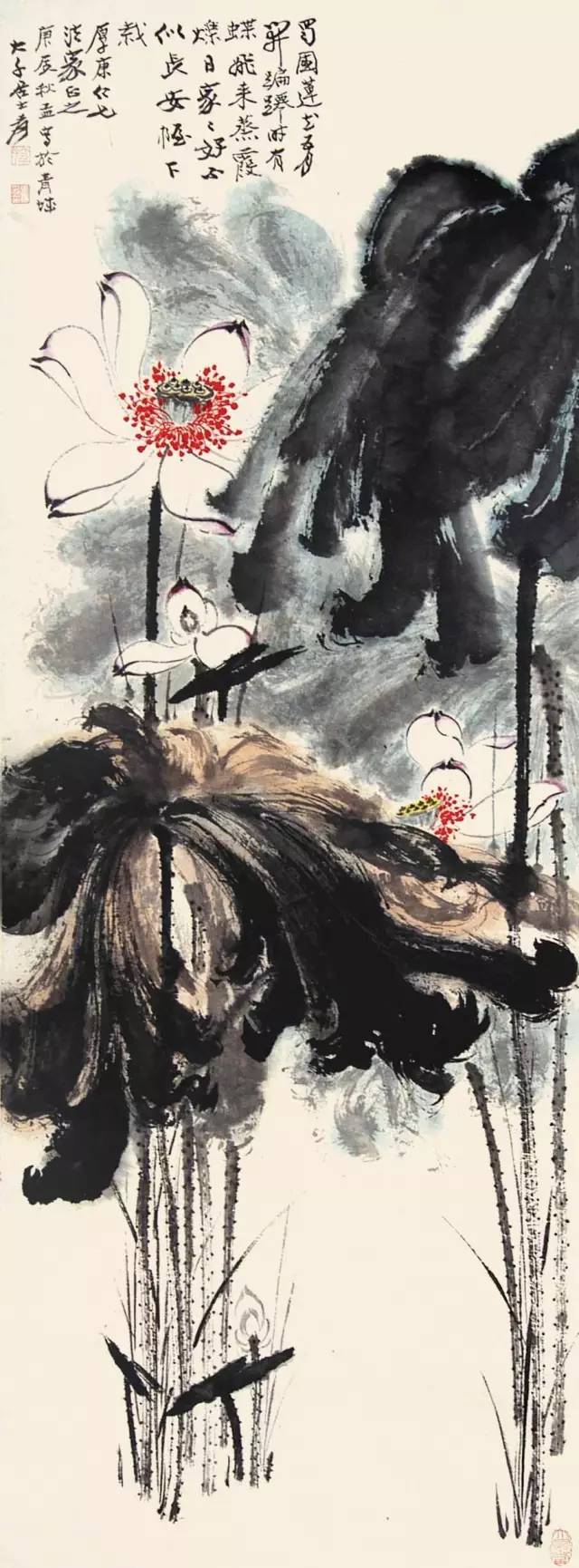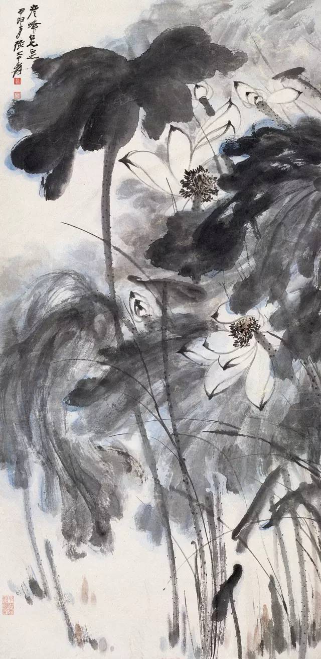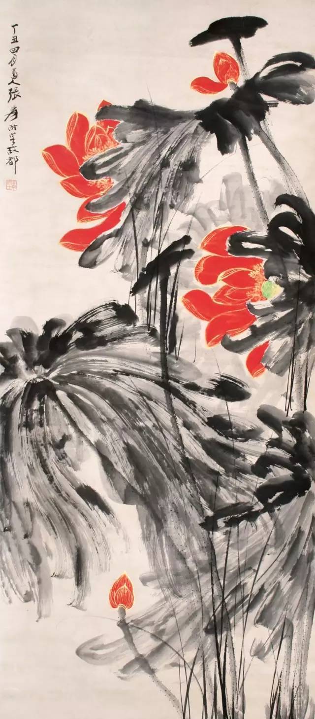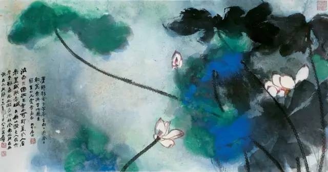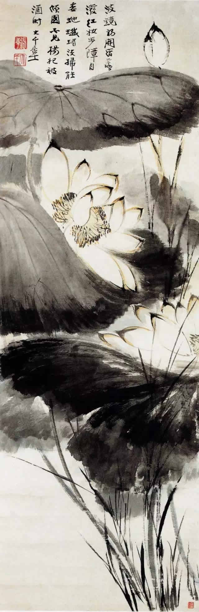 张大千早年画荷花,画法多以明代画家徐渭画法为多,中年时是半工半写者多,到了晚年最擅长以泼彩半抽象手法来画荷花。
