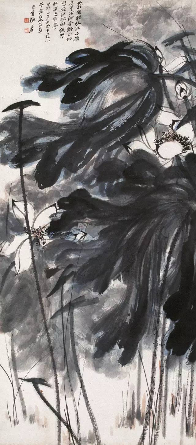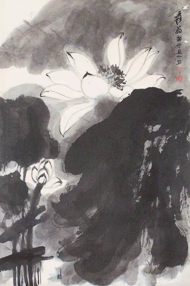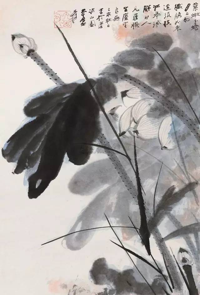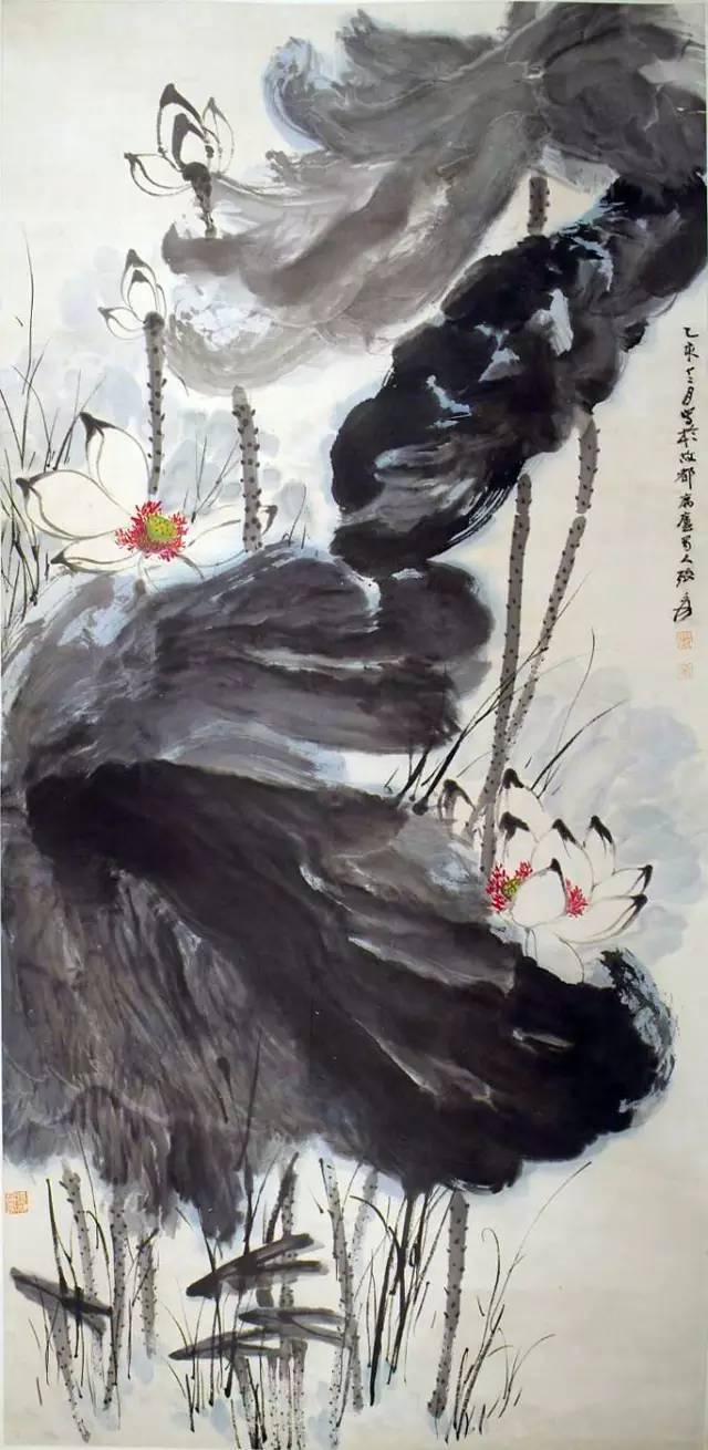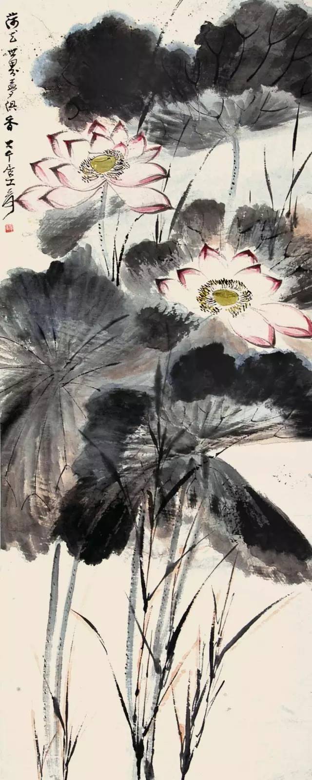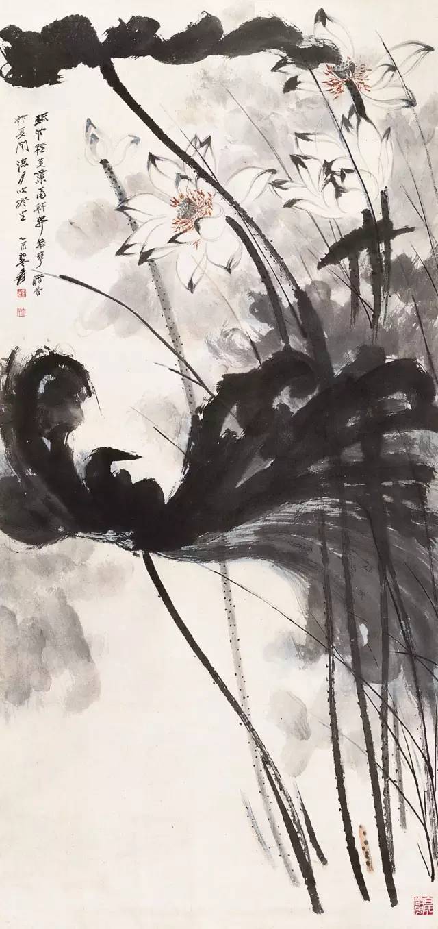 张大千早年画荷花,画法多以明代画家徐渭画法为多,中年时是半工半写者多,到了晚年最擅长以泼彩半抽象手法来画荷花。