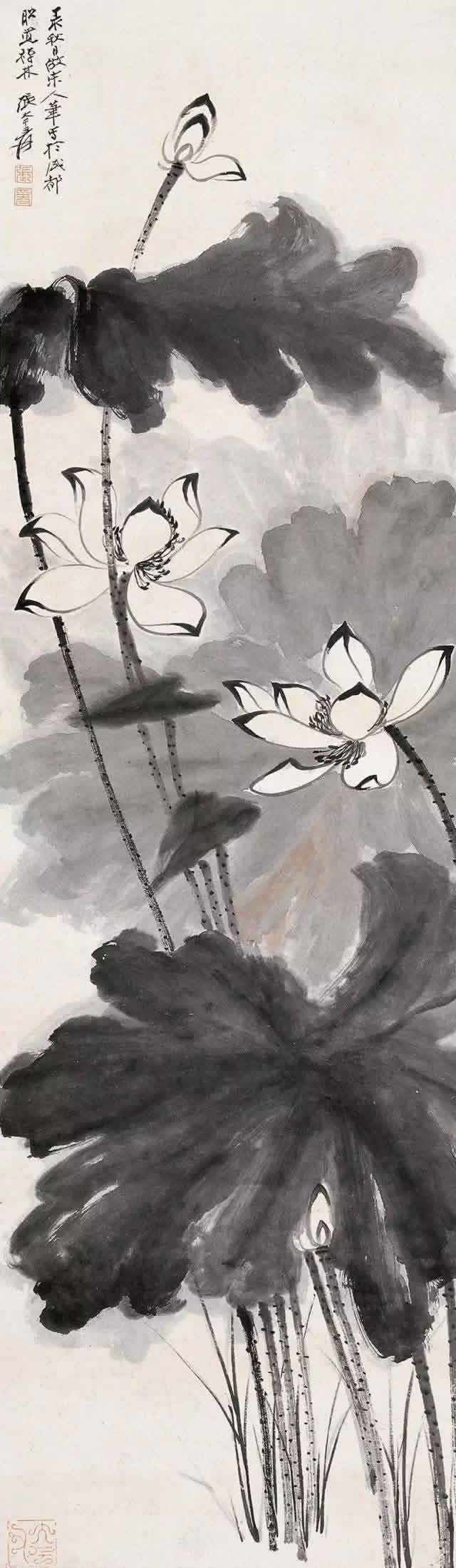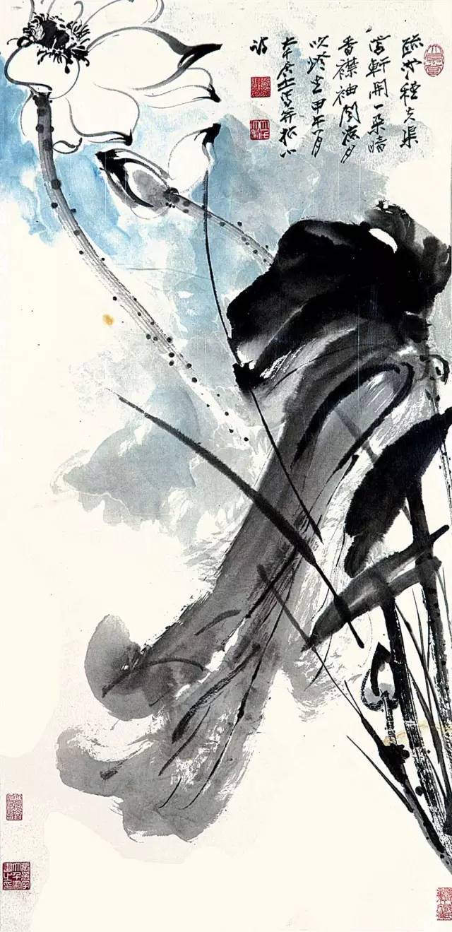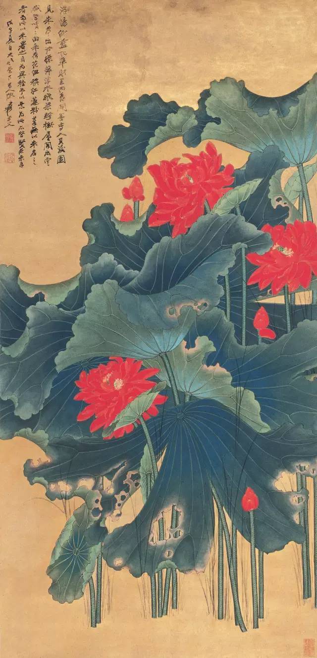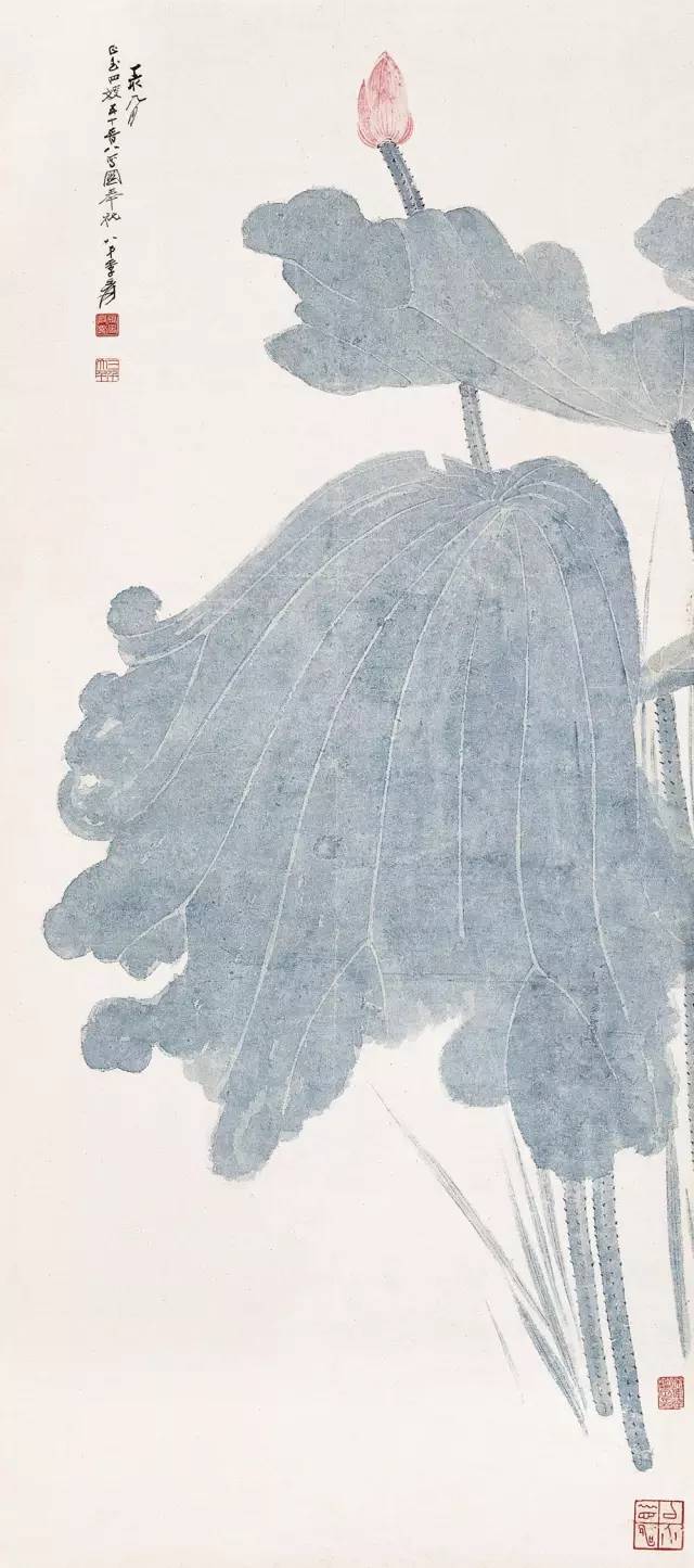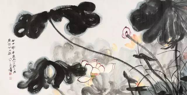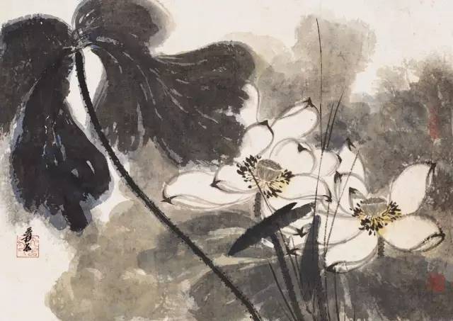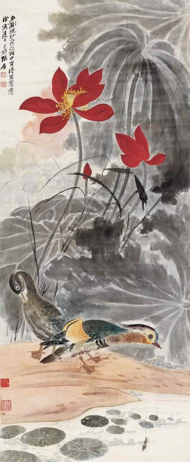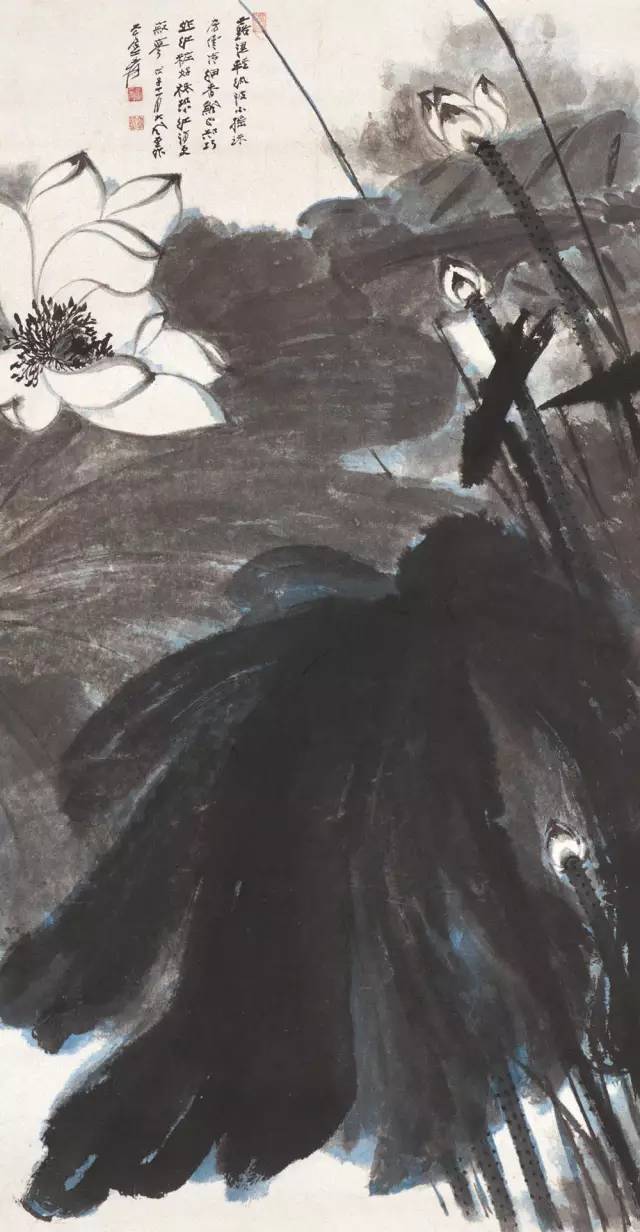 张大千早年画荷花,画法多以明代画家徐渭画法为多,中年时是半工半写者多,到了晚年最擅长以泼彩半抽象手法来画荷花。