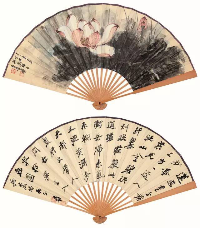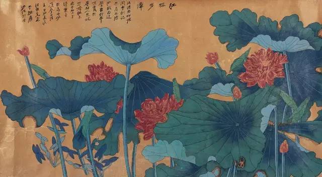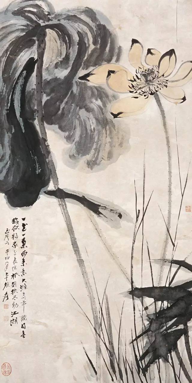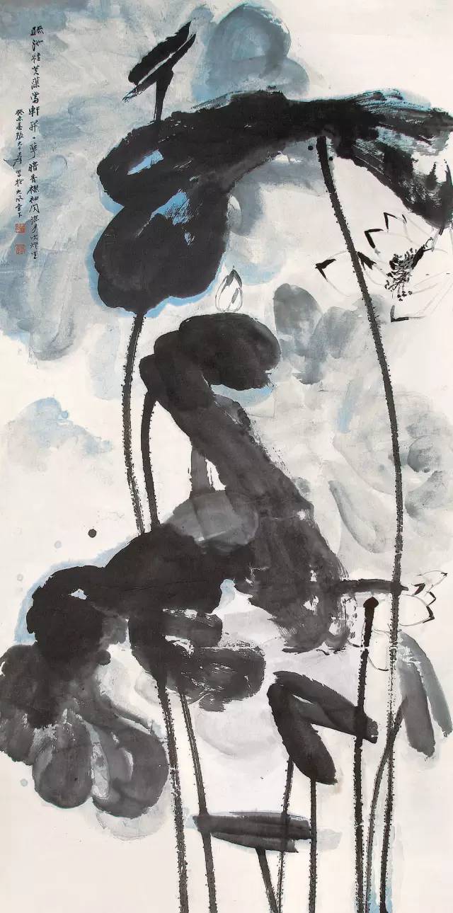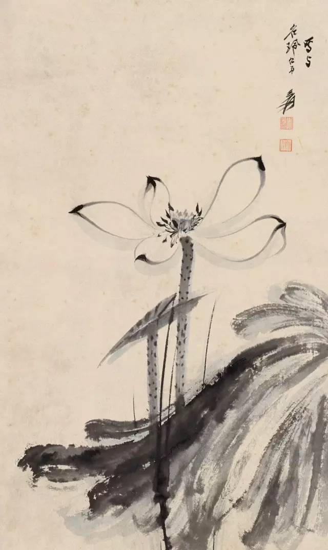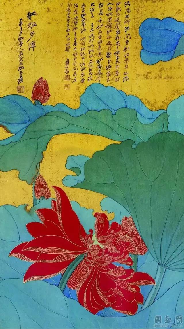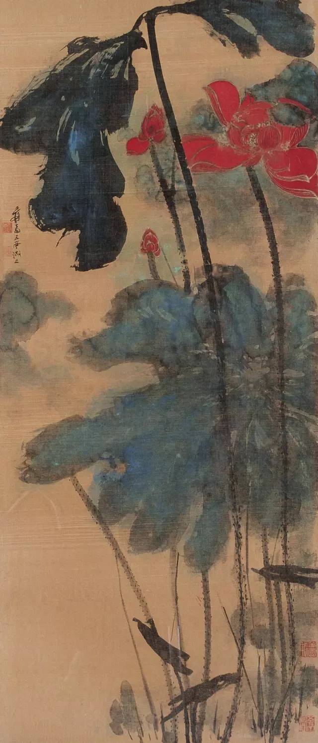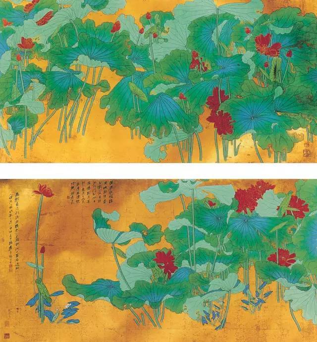 张大千早年画荷花,画法多以明代画家徐渭画法为多,中年时是半工半写者多,到了晚年最擅长以泼彩半抽象手法来画荷花。