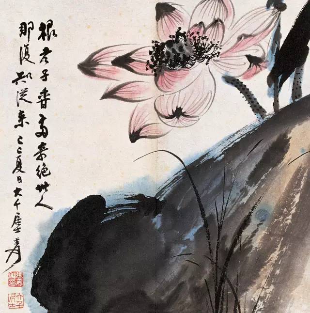 张大千爱荷,一生画荷无数,他以“君子之风,其清穆如”喻荷,盛赞其高洁。每当花开时节,大千都要四处赏花、写生,在居住的庭园内,通常要开辟池塘,遍植荷花,即便在环境稍局促的摩耶精舍,他仍用几只大缸养满荷花。