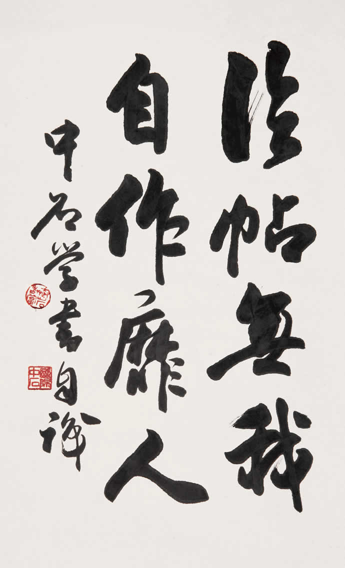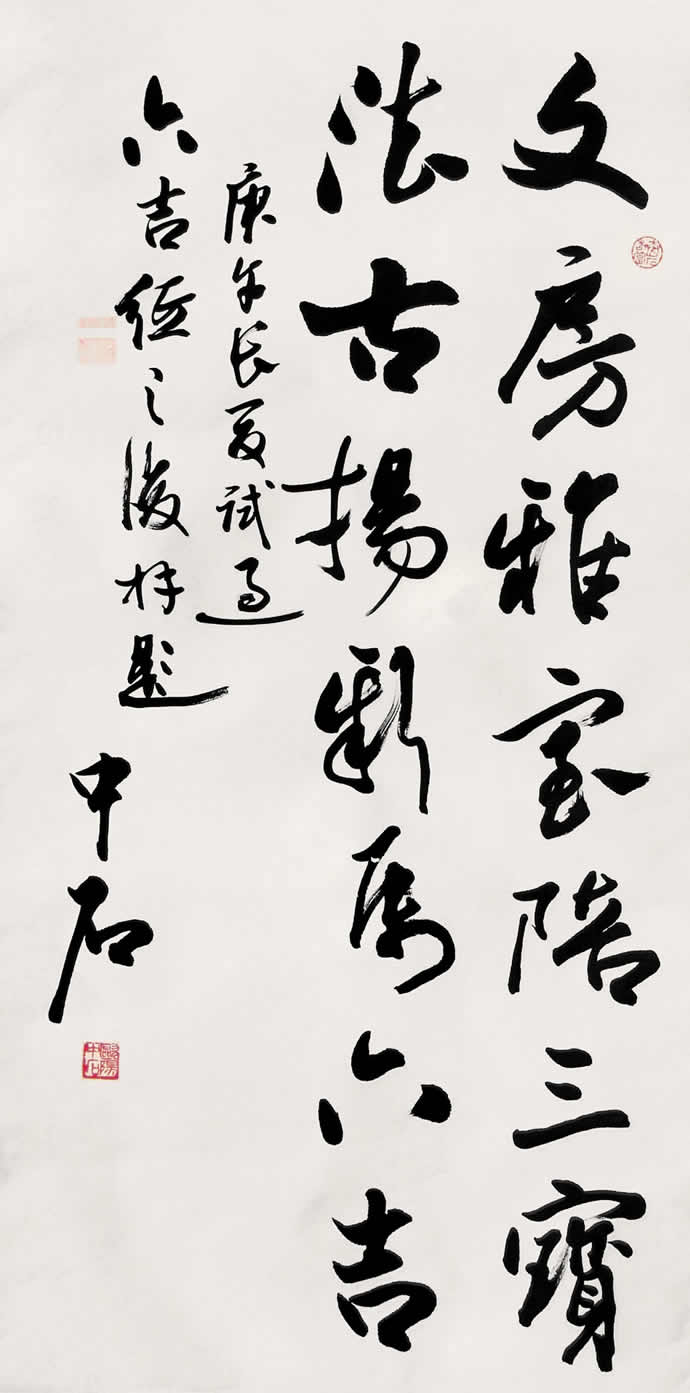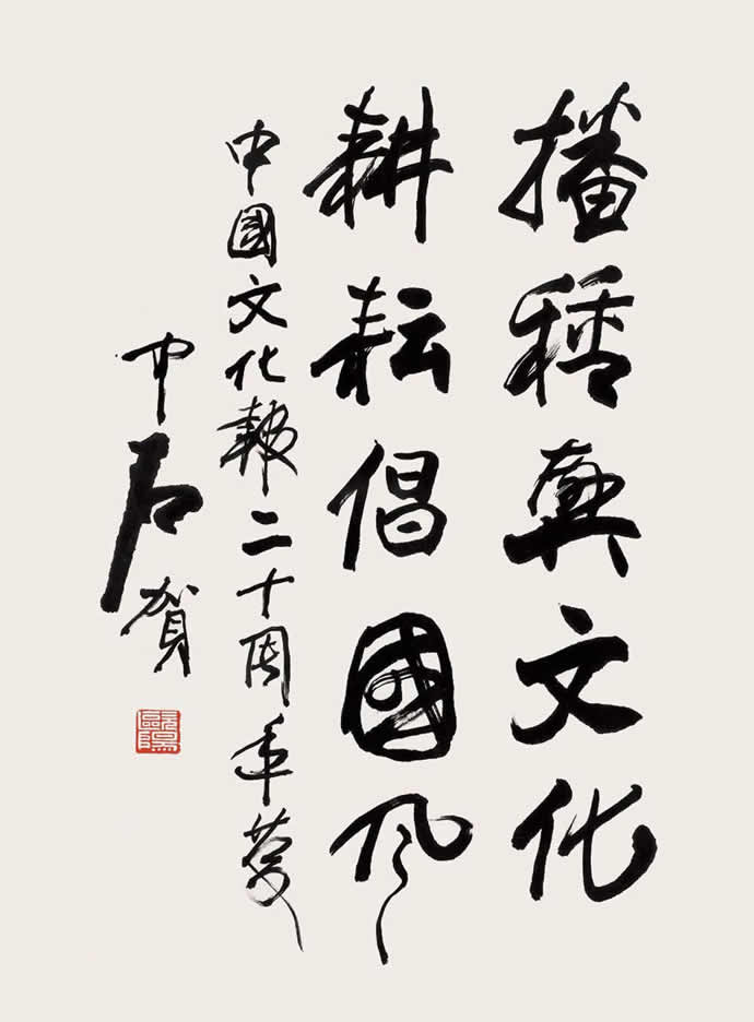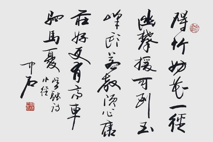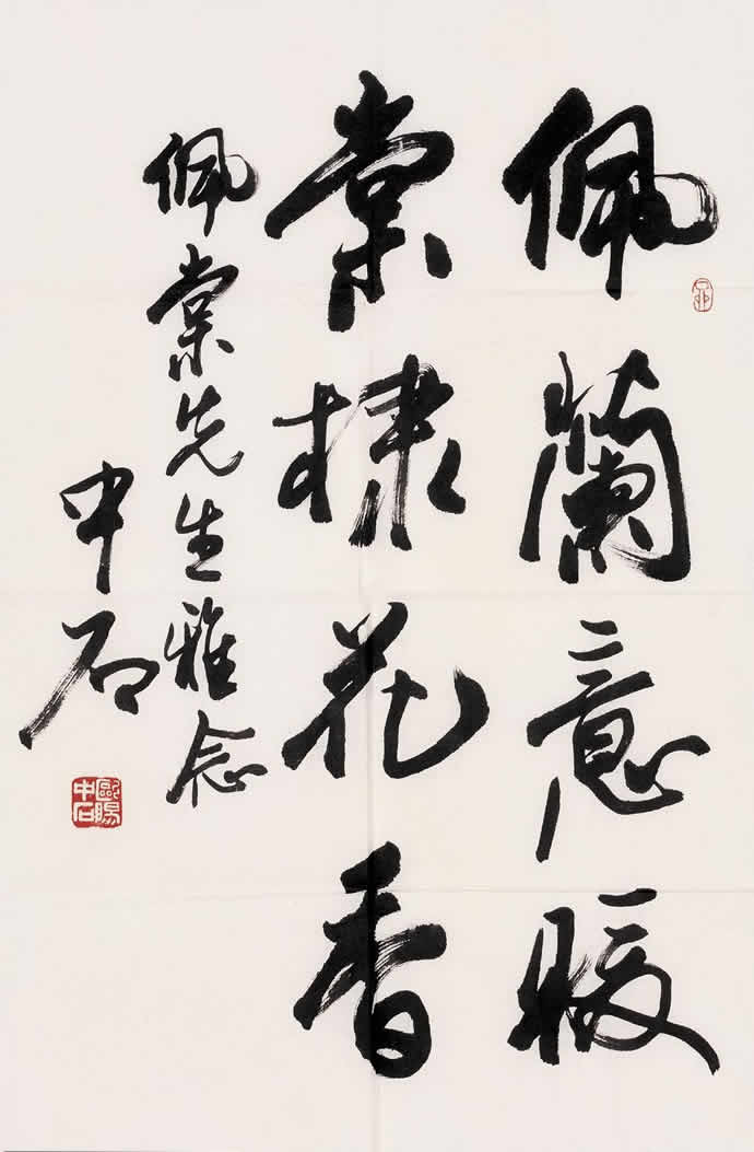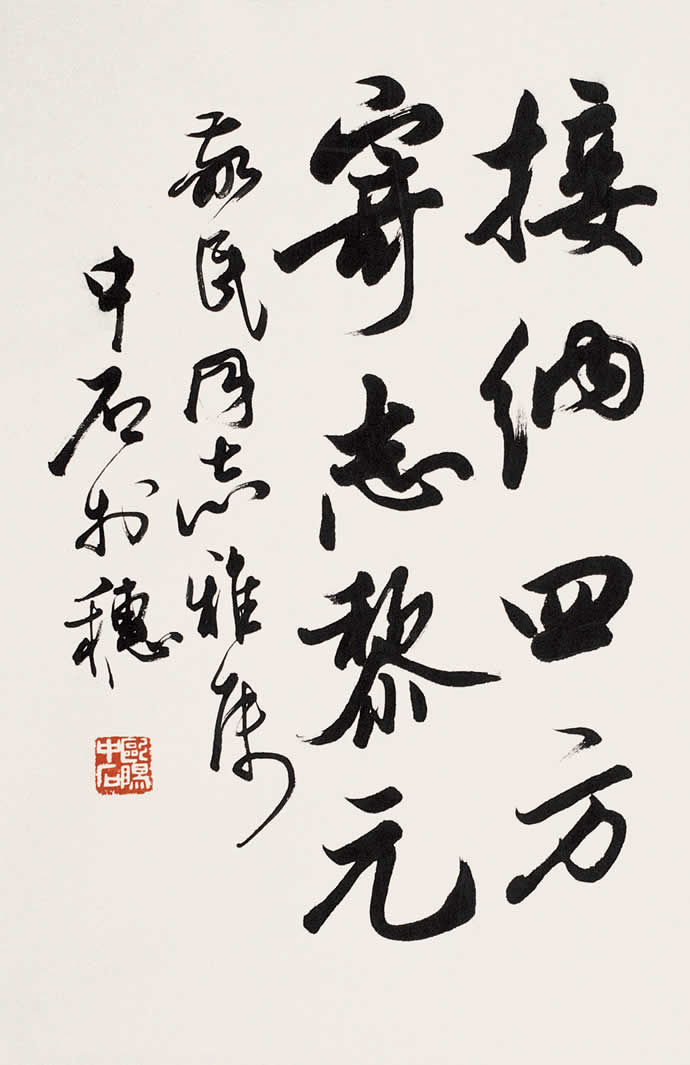 欧阳中石的书法如其为人,格调清新高雅,沉着端庄,俊朗而又飘逸,古朴而又华美。观他的作品,如欣赏高山流水,又如见万马奔腾,足见他无日不临池的深厚功力和勇于创新的精神,开创了一代新书风。