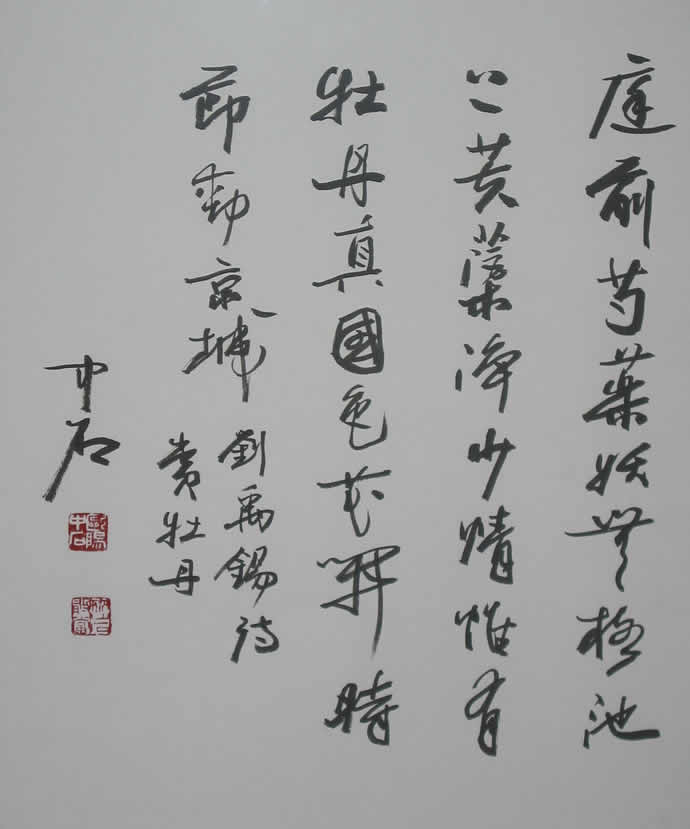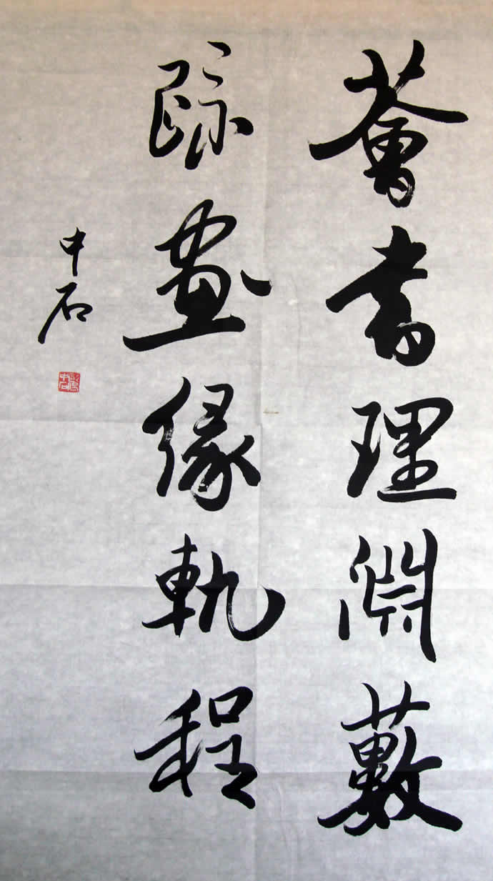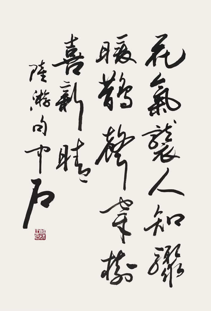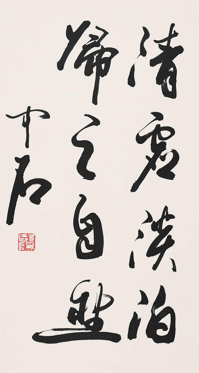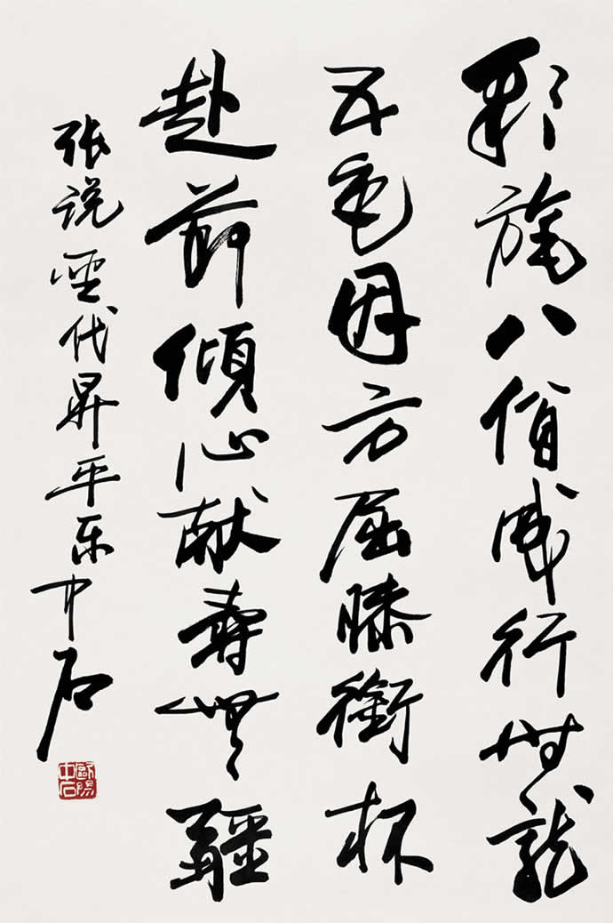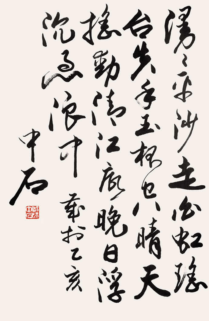 欧阳中石的书法如其为人,格调清新高雅,沉着端庄,俊朗而又飘逸,古朴而又华美。观他的作品,如欣赏高山流水,又如见万马奔腾,足见他无日不临池的深厚功力和勇于创新的精神,开创了一代新书风。