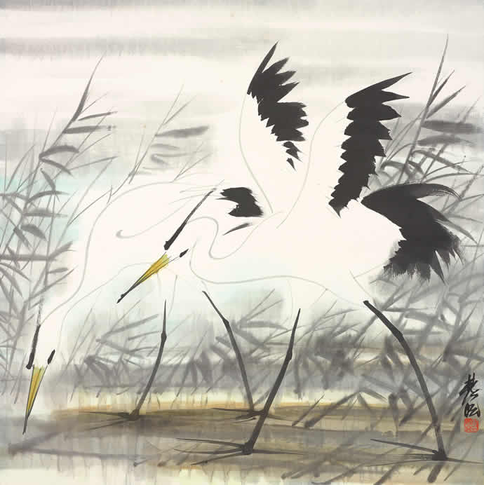 △林风眠 双鹭 纸本 彩墨 69X69厘米