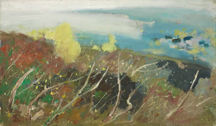 在苏天赐得意的风景杰作中,始终保持一种柔和的晕染、轻快的皴点、流畅的线条与顿挫有力的笔触之间的对比张力,尤其是刻画不同年轮的枝干,在节奏上克服阻碍,有的如燕儿点水,有的似飞马疾驰,内心的情感节奏拉到了极限。与这种感情相对应的,是苏先生在写生过程中的行走、踩踏及各种体验,身体的呼吸和运动,化为画面中的笔触、线条、色块,构成他艺术生命的整体状态。自八十年代后期和九十年代初,苏天赐的绘画风格又发生了变化,这与他的巴黎之行不无关系,他的风景画变得越来越简约、凝练,地域的特征和风貌也在逐渐地消褪,更具有一种抽象的意味和主观的意象。