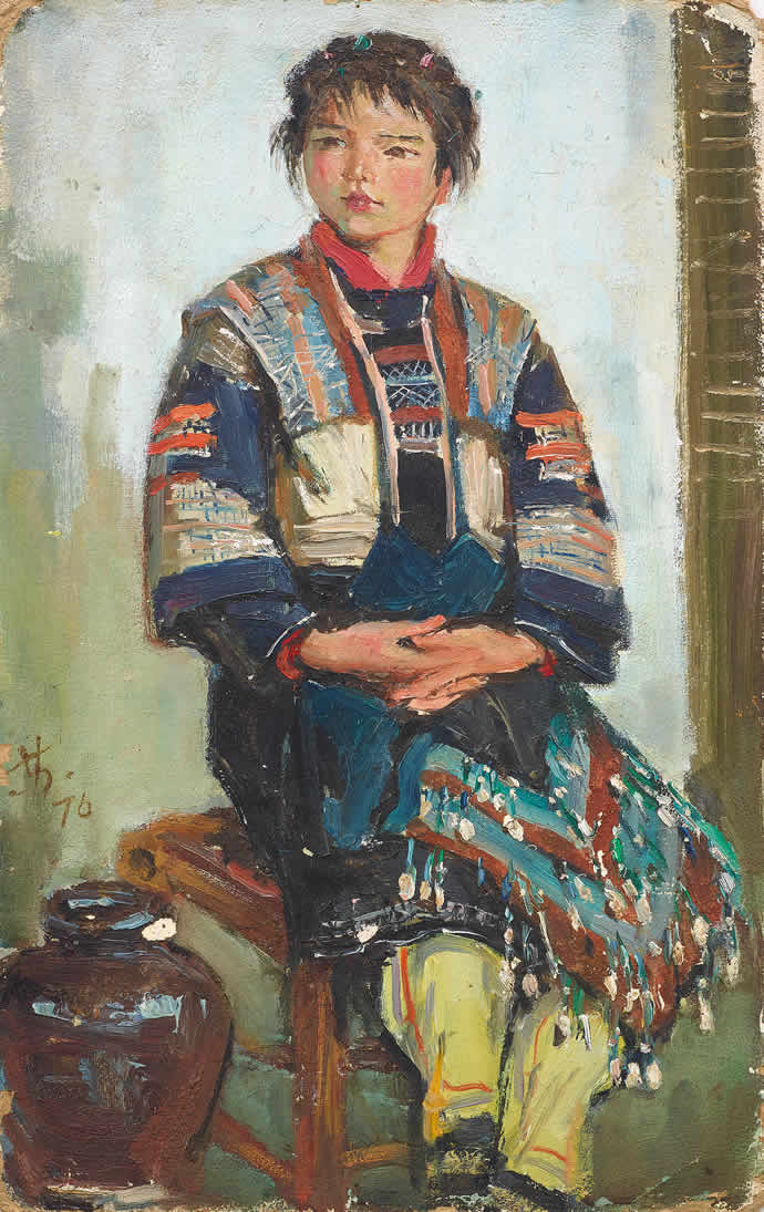 △苏天赐 瑶家姑娘 纸板 油彩 42×27厘米 1976年
