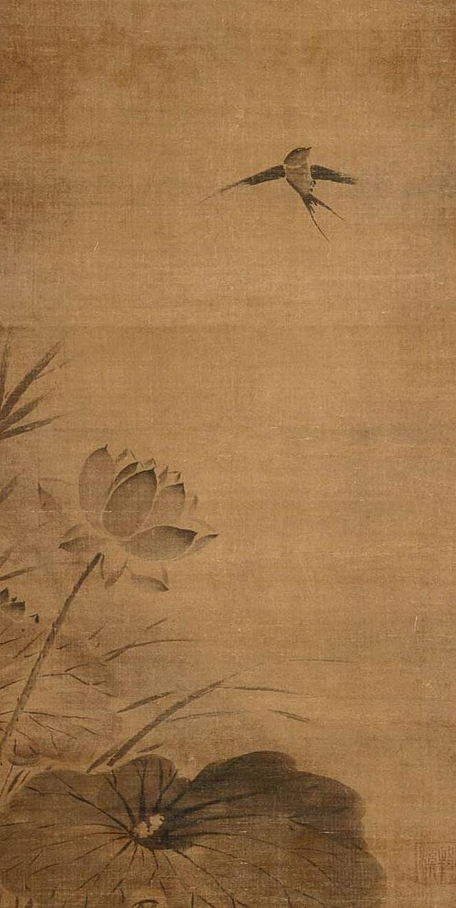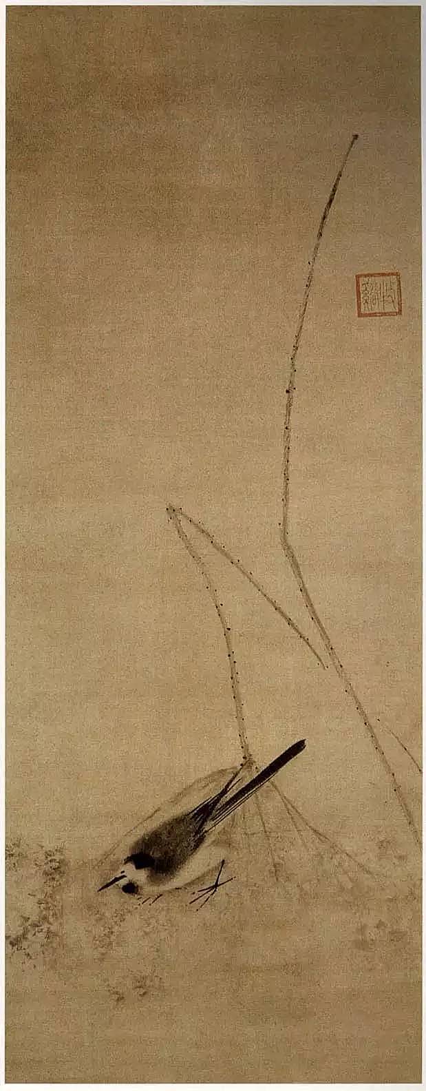 《鸟荷图》 藏于日本。宋代开启了水墨画边角之景的构图方式,牧溪将这一特色发挥得淋漓尽致,并且更以余白反衬出一角的存在,突出了视觉效果,也深化了内涵。水墨画的余白不但给欣赏者留下想像的空间,而且触发人们产生冥想。牧溪的画属于禅画的范畴——简逸豪放、自然清净、空灵淡泊,禅画不同于文人画,不拘泥于笔墨或气韵,将“生命的解脱”视为最高存在意涵,一切存在现象都是生命最纯真的现实界的烙印。并不是所有人都没有体会出牧溪作品的妙处,晚明高僧雪峤圆信的对牧溪作品有这样的一段描述:“这僧笔尖上具眼,流出威音那边,鸟鹊花卉,看者莫作眼见,亦不离眼思之,径山千指庵圆信。”